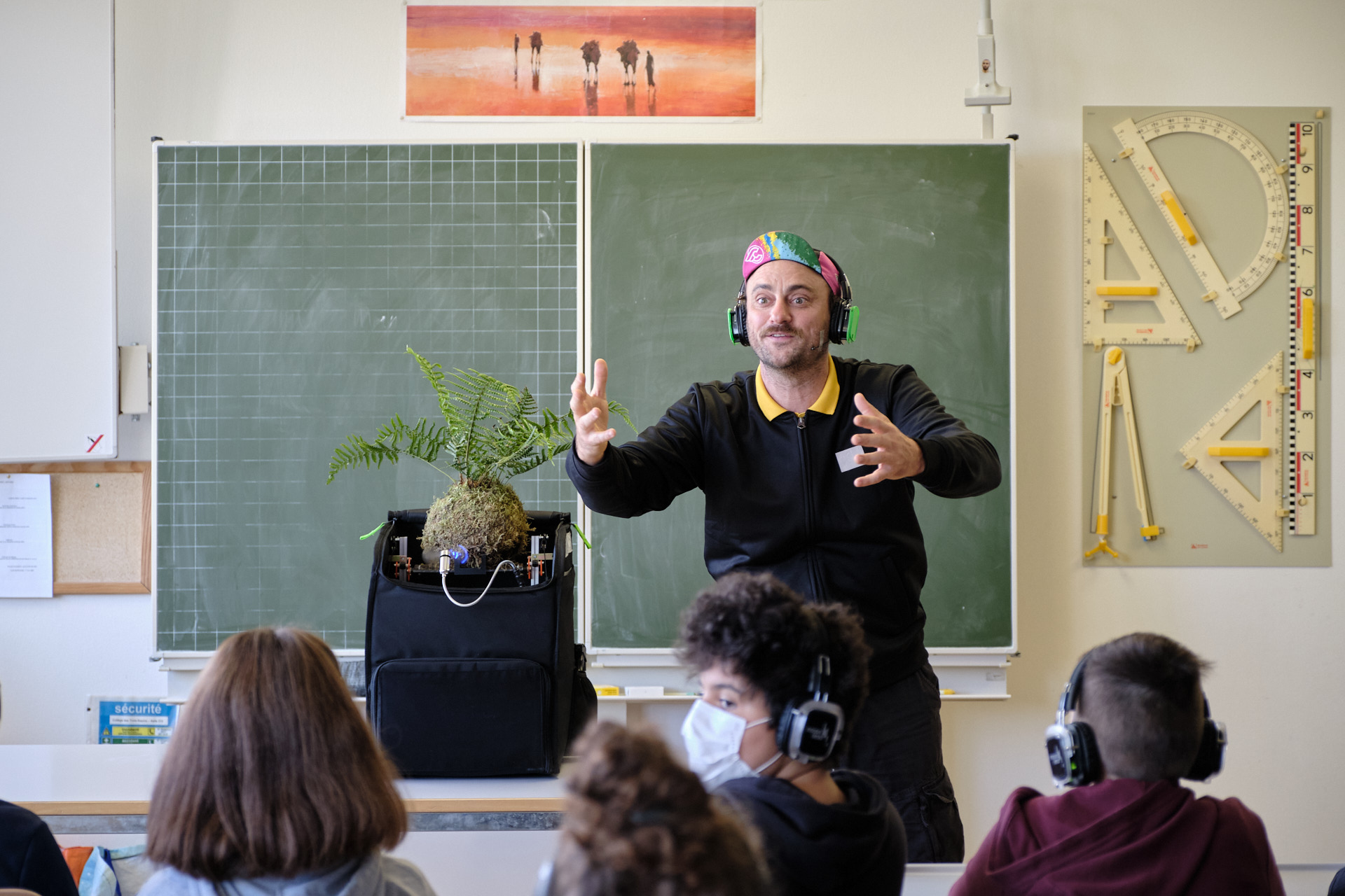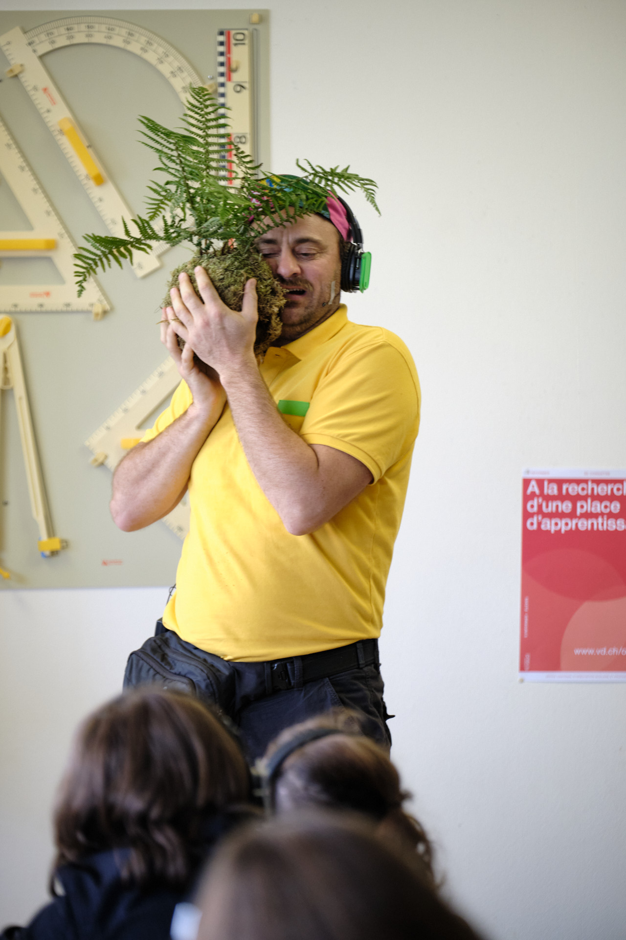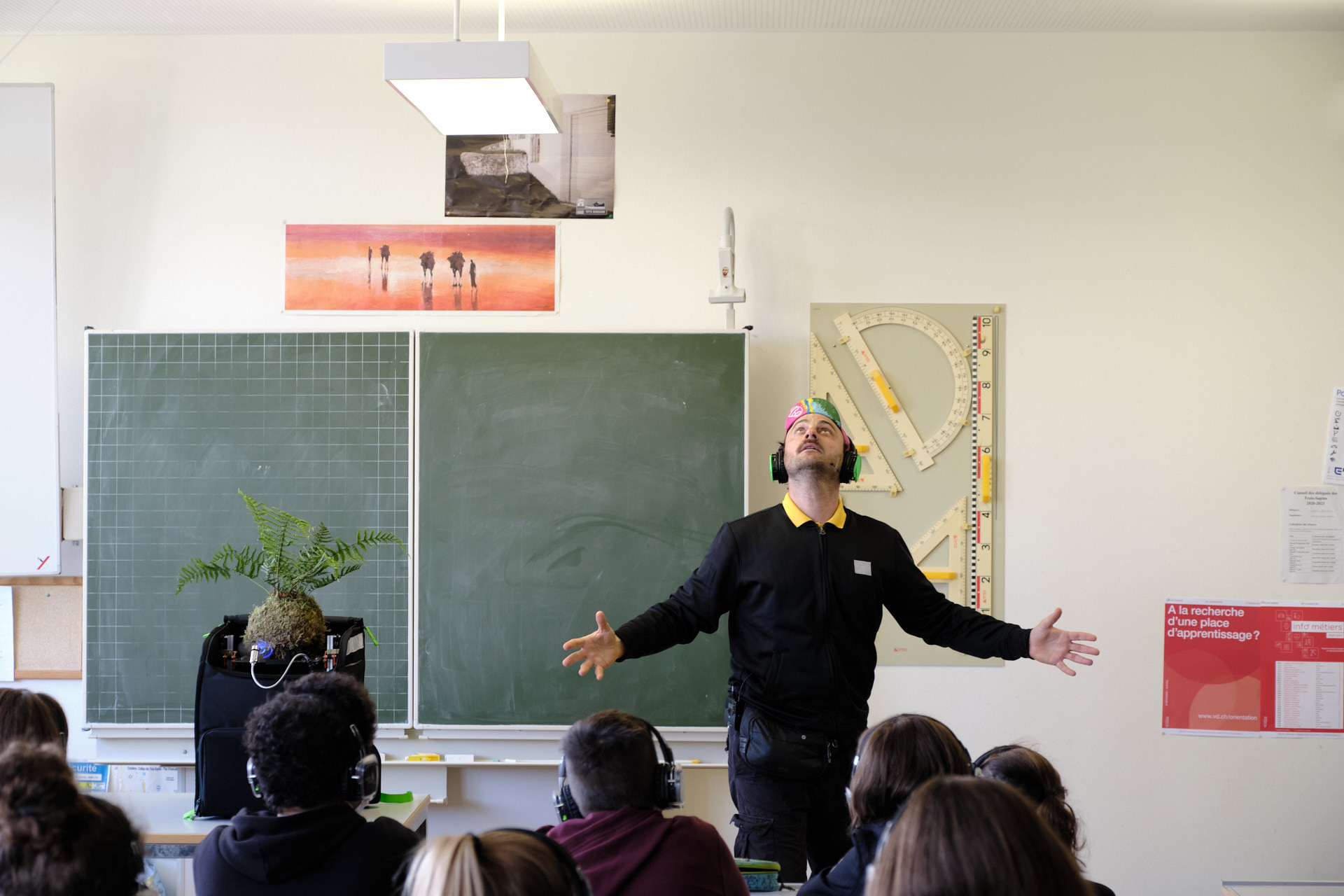 Coutumier des salles de théâtre obscurcies où il fait bon avoir repéré l’espace avant le début du filage, Philippe Weissbrodt se retrouve dans une salle de cours du Collège des 3 Sapins, à Échallens, avec deux classes secondaires le temps d’une représentation d’Arboresence programmée; un spectacle atour de l’écologie de Muriel Imbach, pensé “hors les murs” et produit par le Théâtre Vidy-Lausanne…