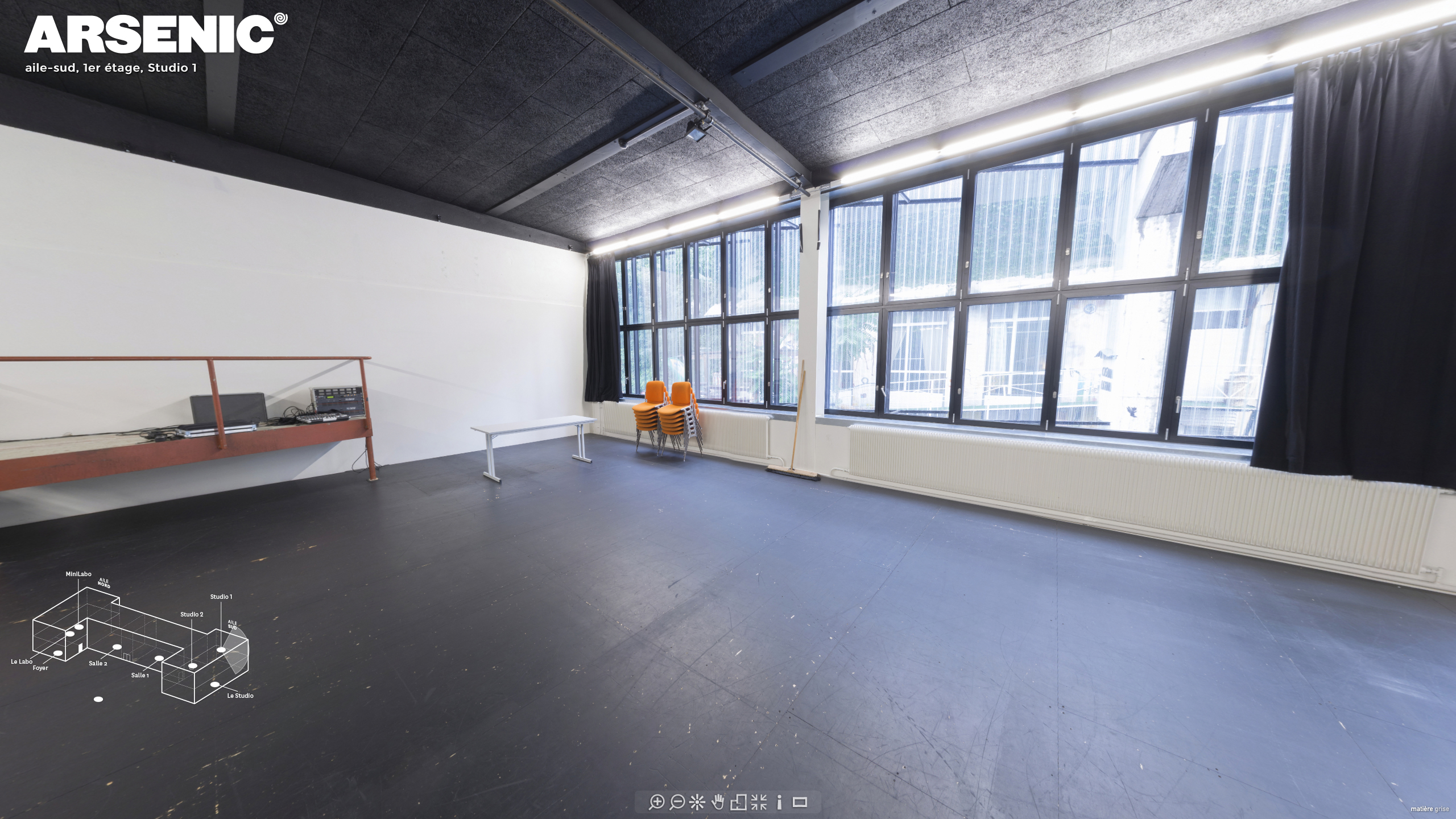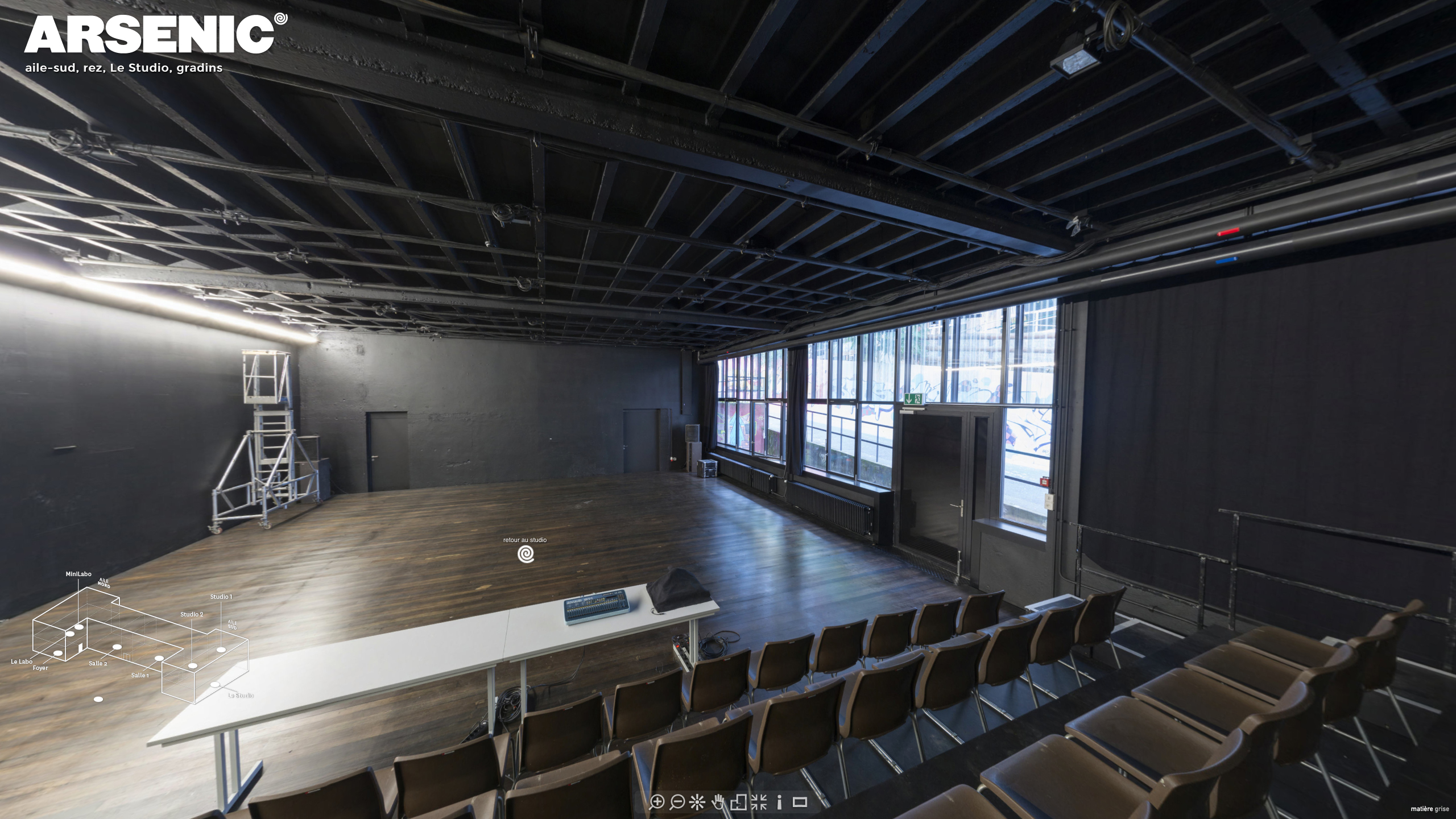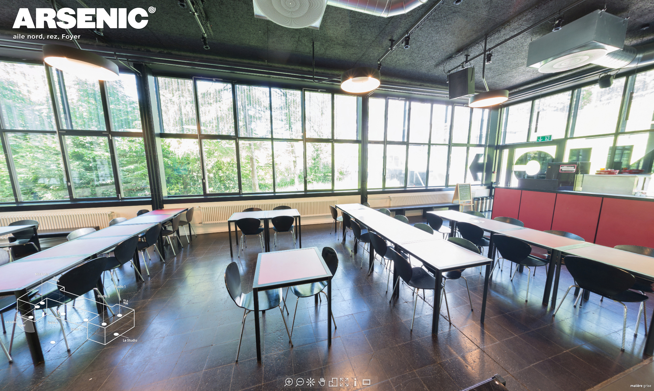 Aujourd’hui, la visite virtuelle parcours les principaux espaces de l’Arsenic et est mise à jour en fonction de l’évolution des locaux.