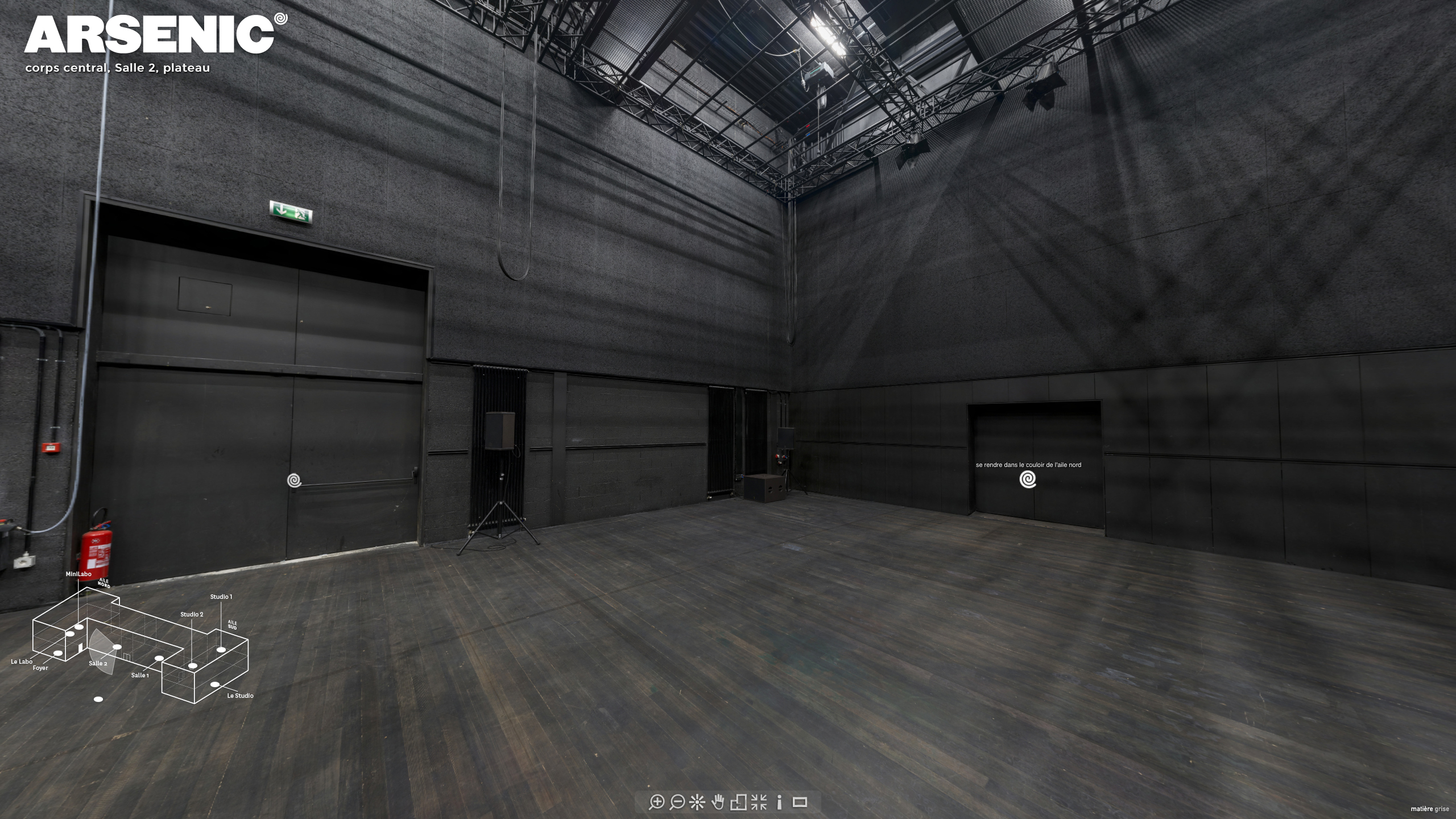En 2014, le centre d’art scénique contemporain Arsenic, à Lausanne, a commandé à matière grise une visite virtuelle de ses locaux. La finalité était en premier lieu de pouvoir présenter les salles aux compagnies en résidence ou en tournée, ainsi qu’aux techniciens.