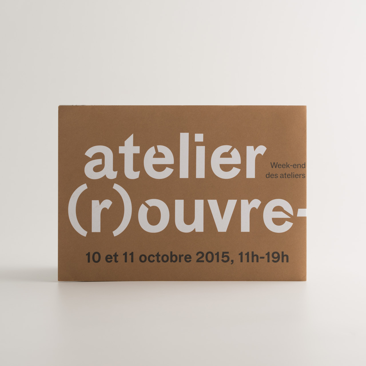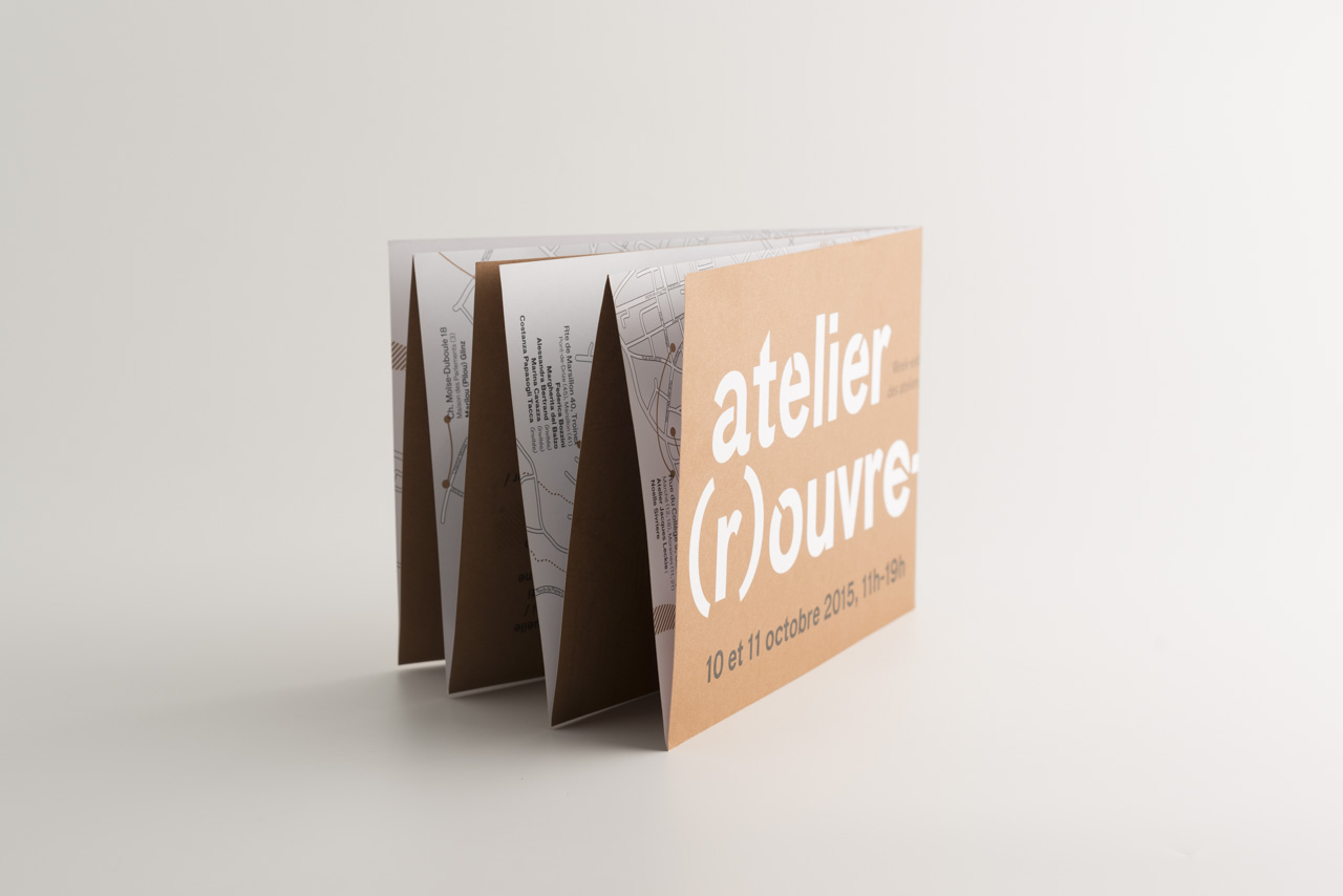Dépliant A2 comportant au recto une affiche avec les artistes ouvrant leur atelier au public le temps d’un week-end, ainsi que les informations de date et d’heure. Au verso se trouve un plan de Genève permettant aux visiteurs de trouver les ateliers.