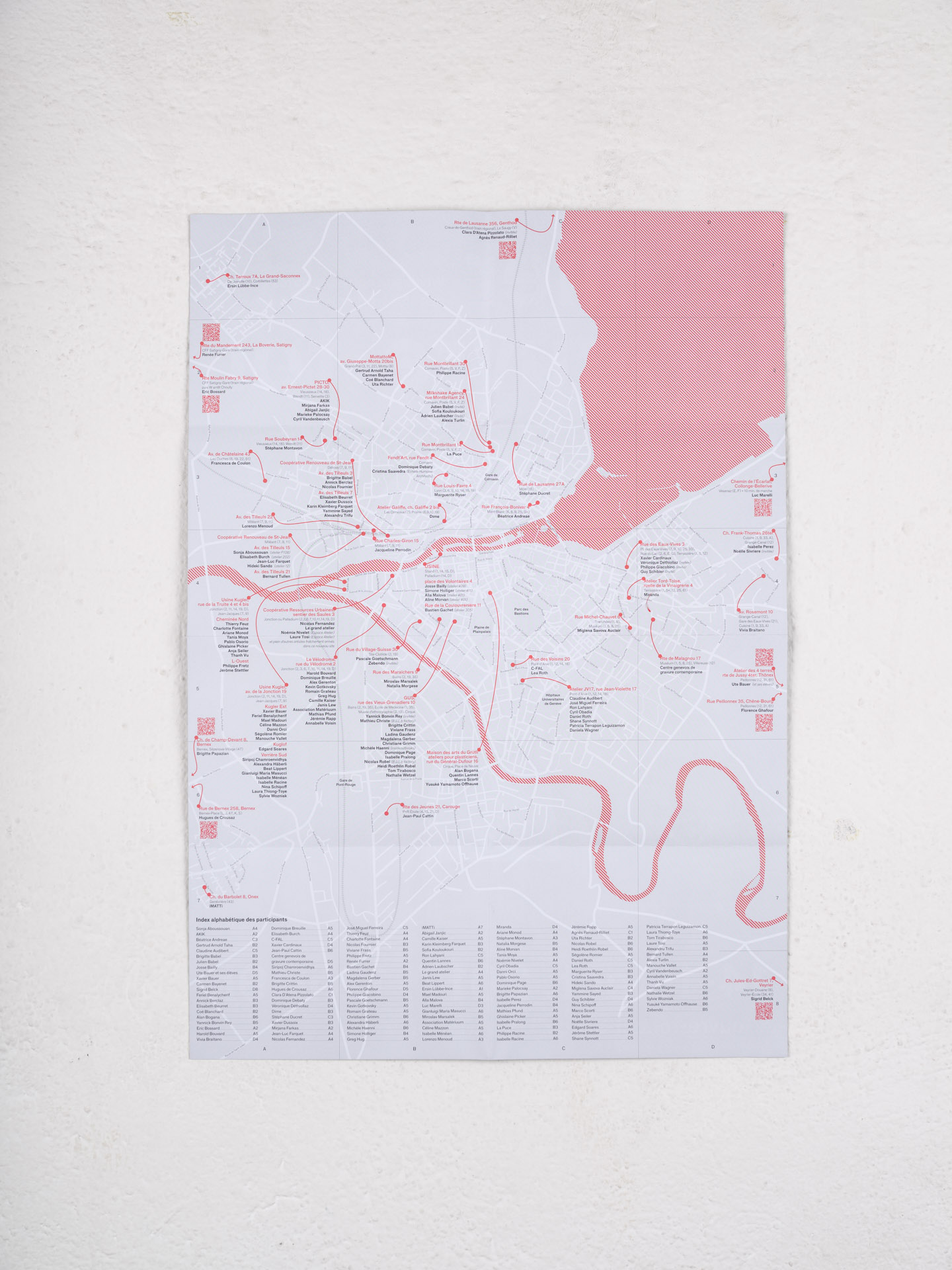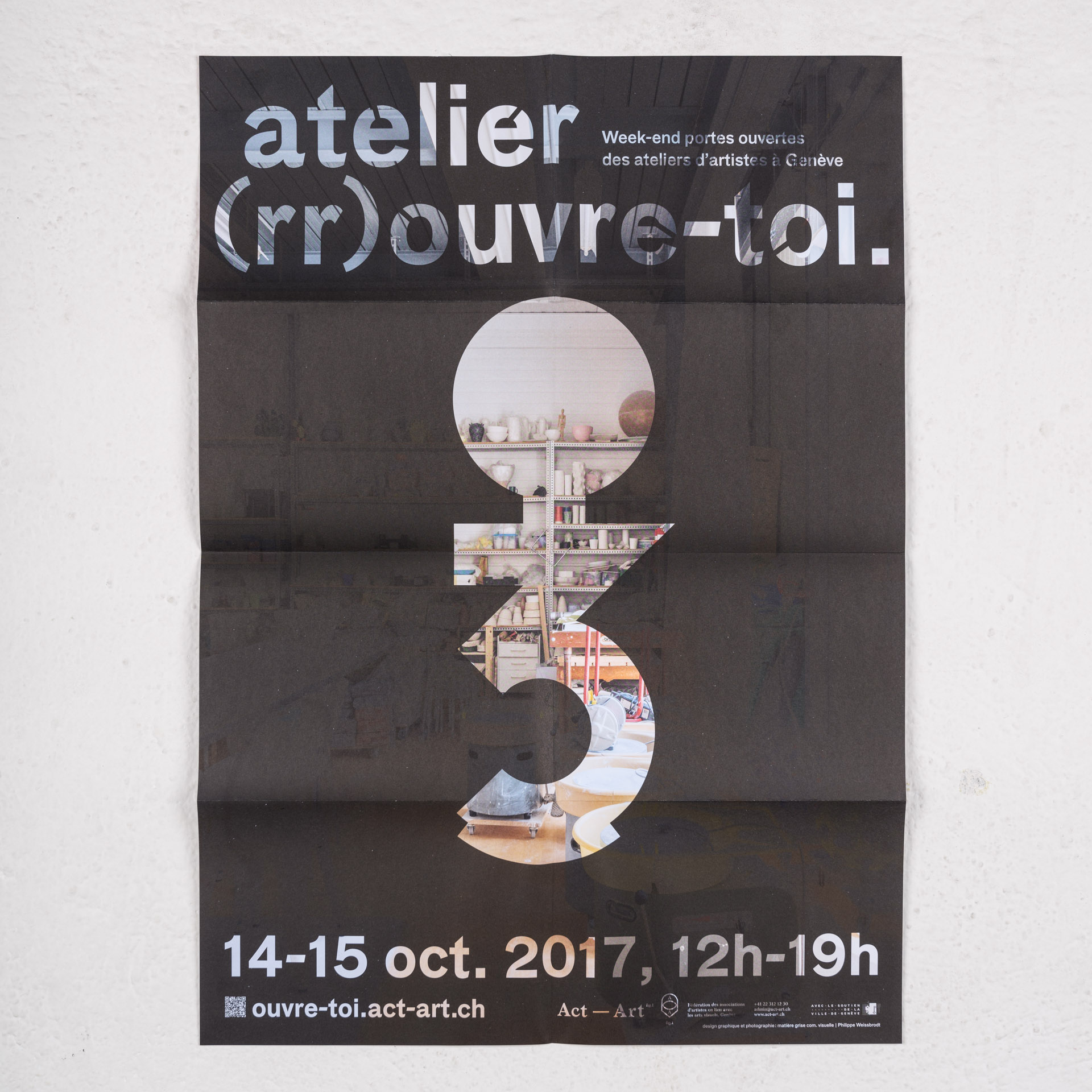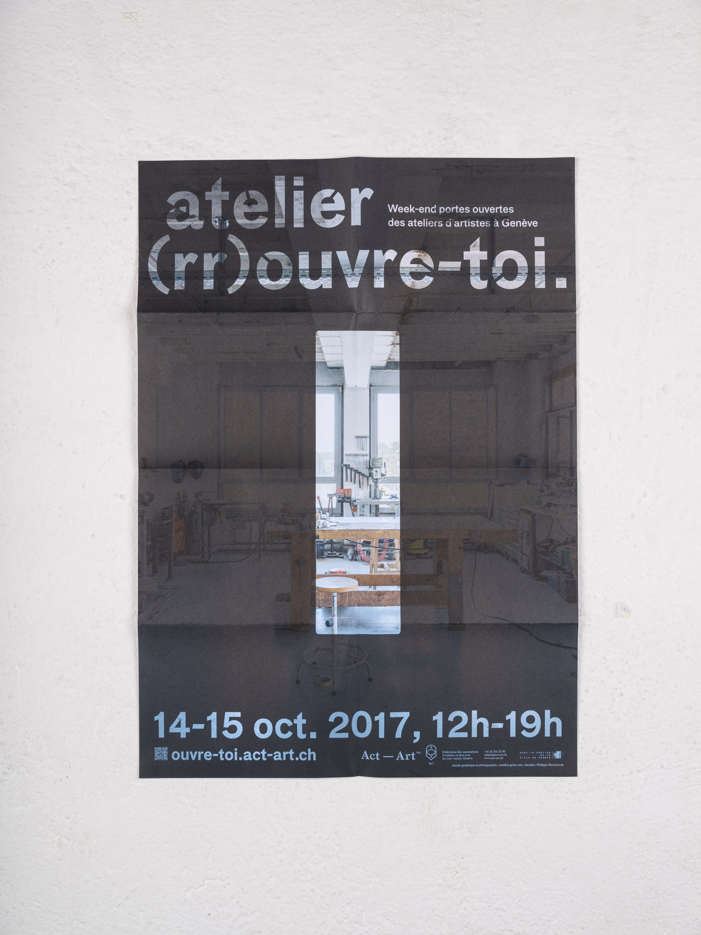 Dépliant A2 comportant au recto une affiche avec les artistes ouvrant leur atelier au public le temps d’un week-end, ainsi que les informations de date et d’heure. Au verso se trouve un plan de Genève permettant aux visiteurs de trouver les ateliers.