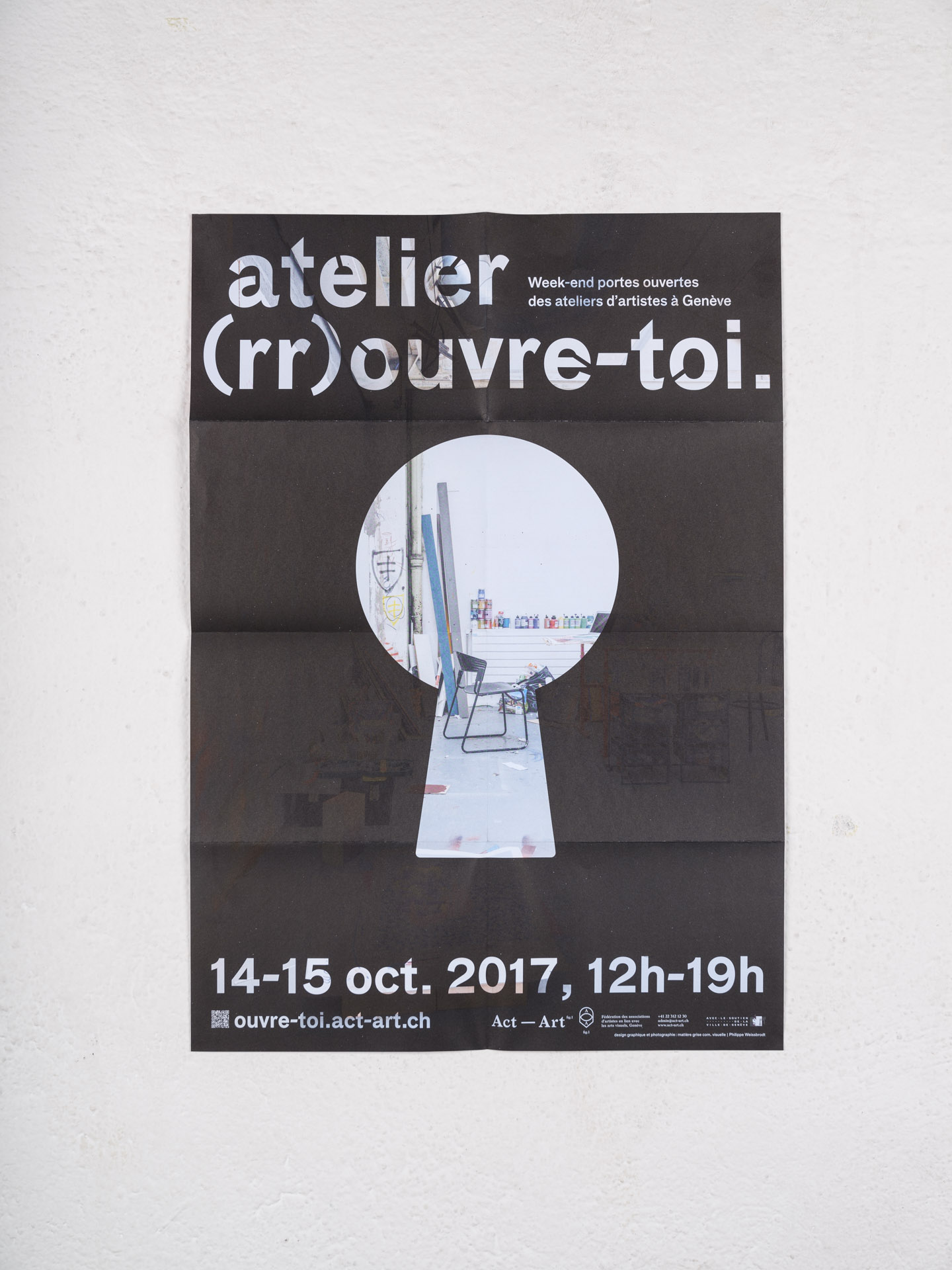 En 2017, matière grise part de l’idée du regard par le trou de la serrure, toujours dans la thématique d’aller voir ce qui est habituellement gardé hors de portée du public. Philippe Weissbrodt réalise des photographies de trois ateliers à la chambre photographique moyen-format, qui sont reproduites sur l’entier de l’affiche. Un nouvelle couche d’encre noire est surimprimée, laisasnt transparaître les informations de l’événement ainsi que, au centre, un peu de l’atelier “comme à travers un trou de serrure”.
