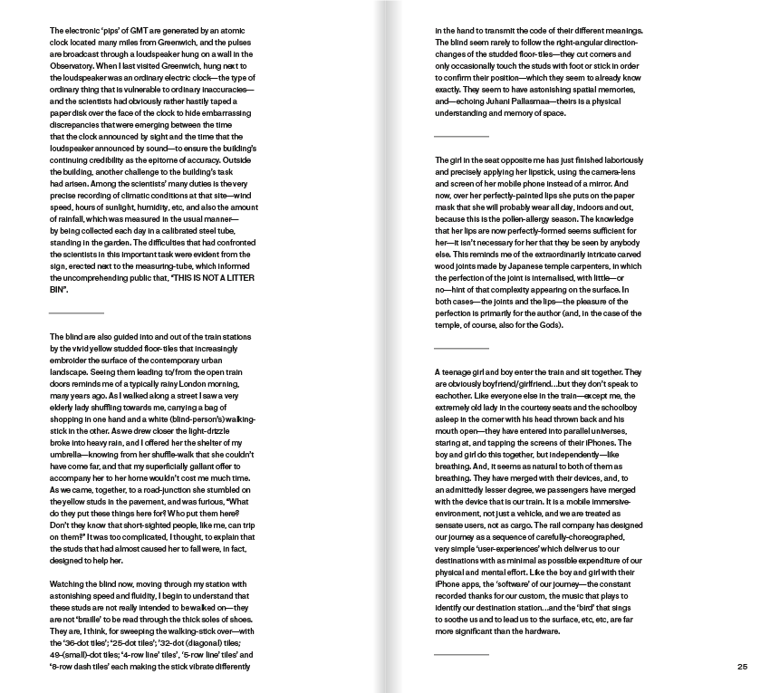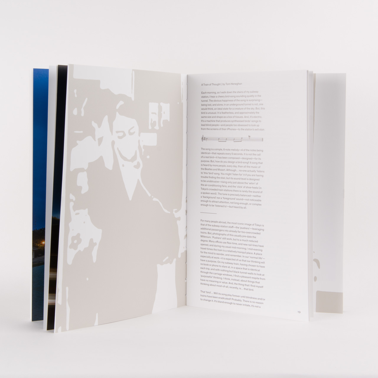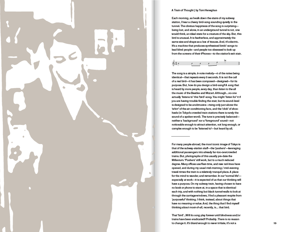C’est en écho à cette spécificité de la construction que Bernex a été conçu, en cassant le rythme régulier des pages d’illustrations par une partie intermédiaire de pages plus étroite qui rappelle le décrochement de l’étage du milieu du bâtiment. Ces huit pages servent de support à l’insertion d’un texte de Tom Heneghan: A Train of Thought qui relate l’expérience de sa propre confrontation à son environnement urbain, son espace, les personnes et les sons qui l’entourent, par le biais d’un trajet dans le métro de Tokyo.