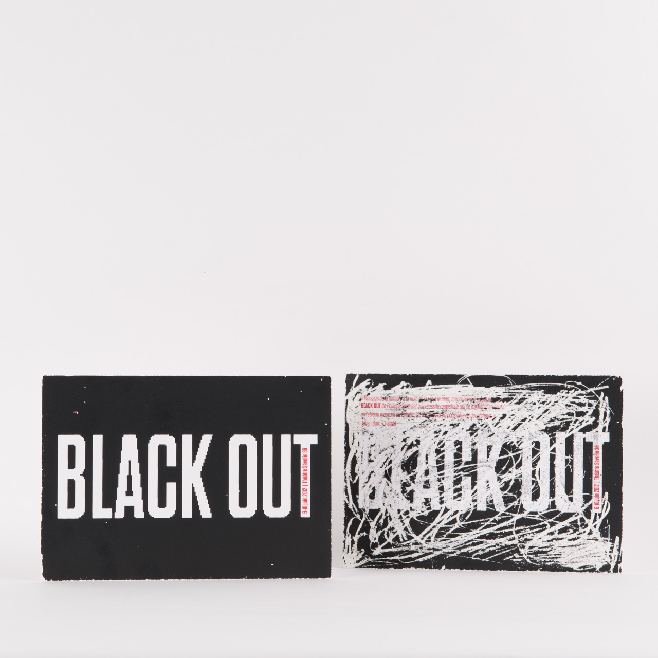 Le travail de design graphique de matière grise a été réalisé dans le prolongement de l’idée du pigment noir qui est déplacé pour créer des formes par contraste avec le fond blanc sur lequel il est disposé. C’est ainsi, par exemple, que, pour la série de cartes postales réalisées pour ce spectacle, l’une d’elle a été conçue avec une encre noire grattable, dont l’abrasion laisse apercevoir le fond blanc et révèle des éléments de texte. Le visuel de tous les autres éléments de communication (affiche, brochure, flyer, pochette de DVD, etc.) sont alignés sur l’idée des pigments ou pixels noirs laissant apercevoir le fond blanc et s’écartant sur les lettres du titre Black Out.