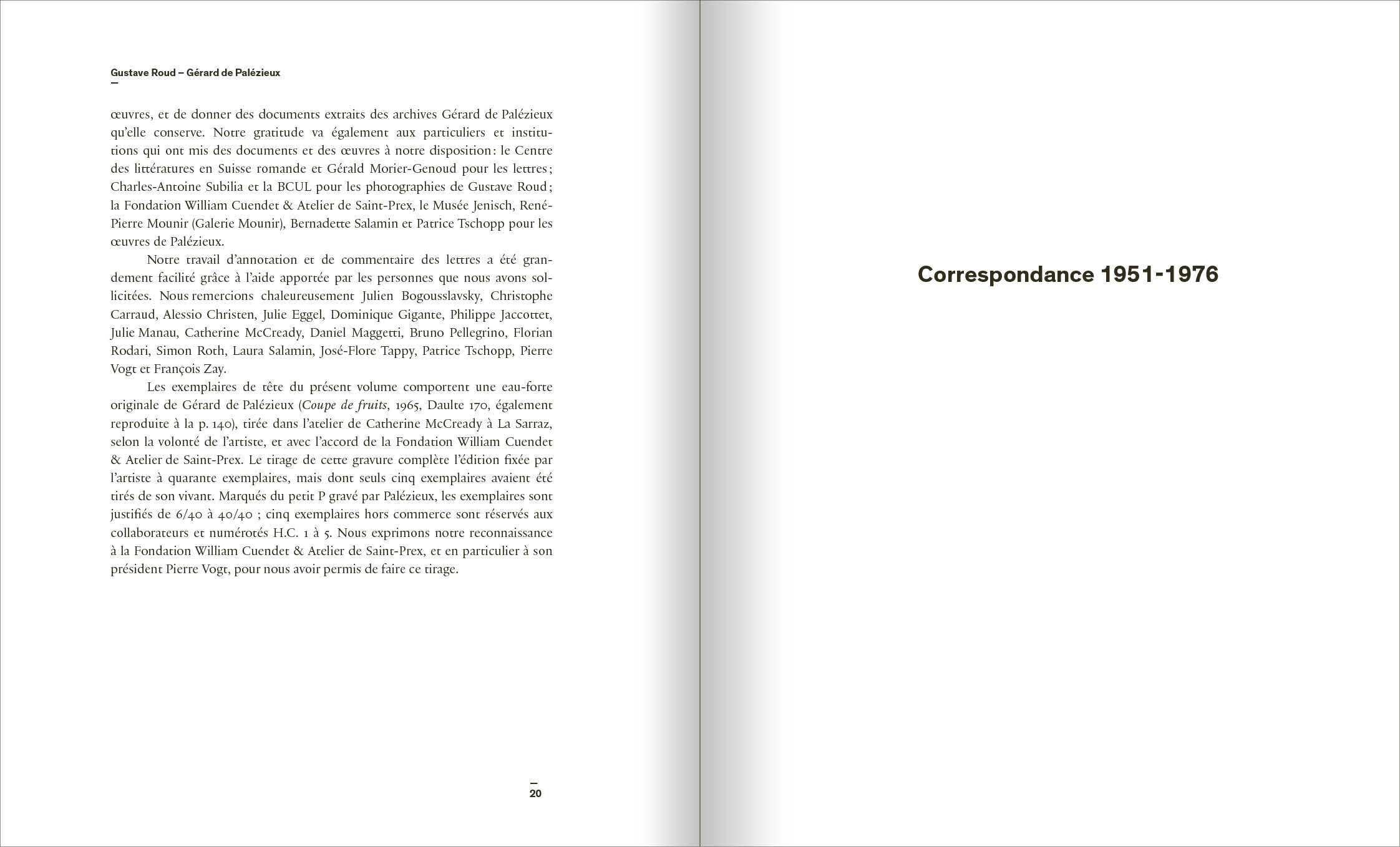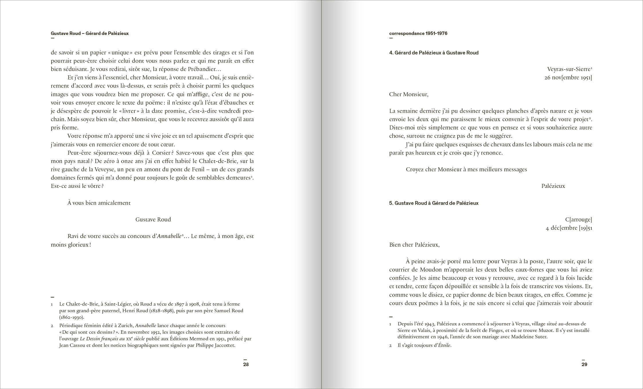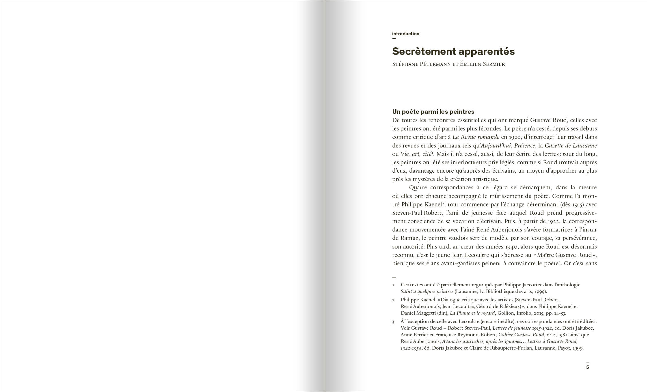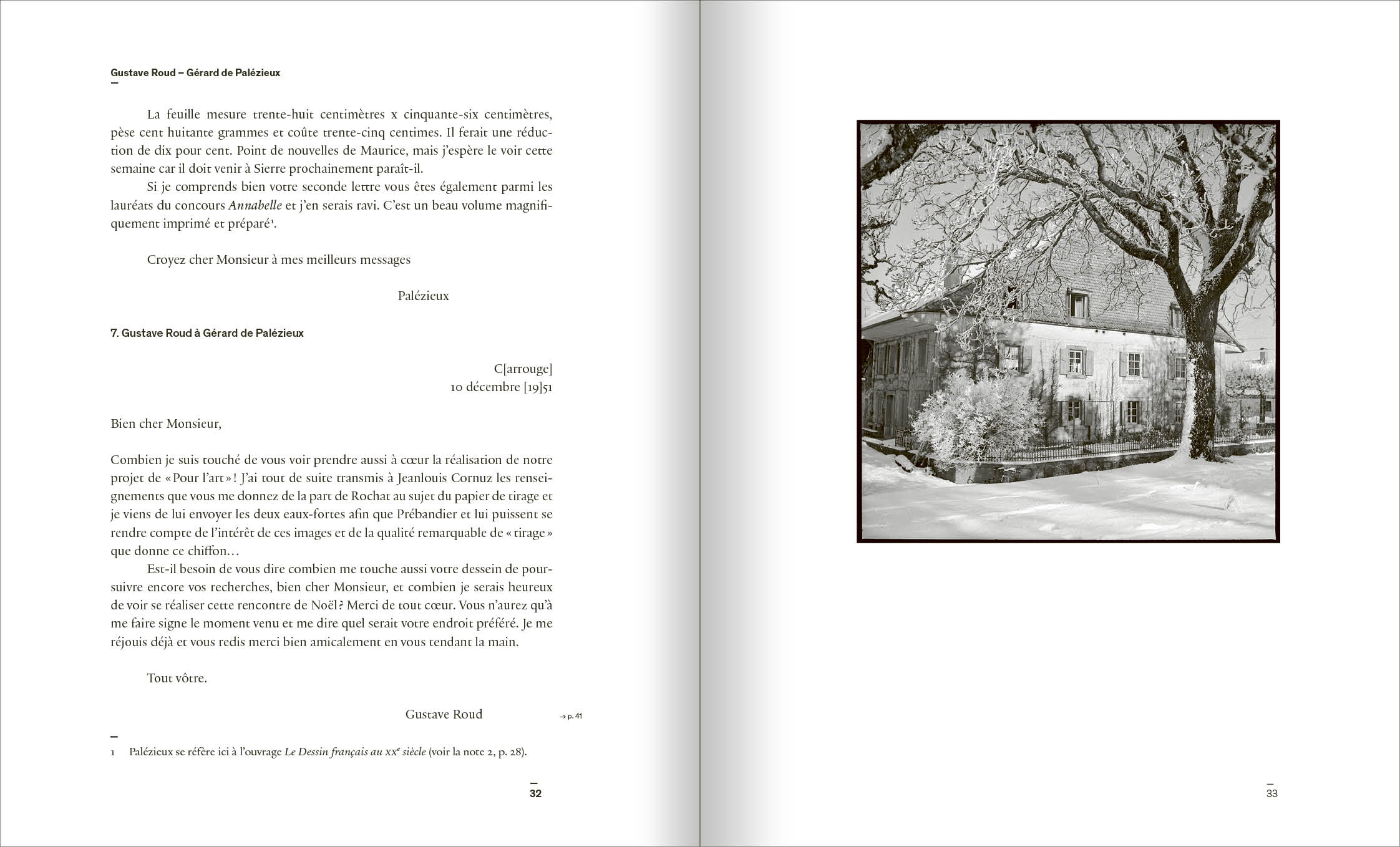 Le format extérieur de la publication n’a pas changé. Les choix typographiques sont issus de la création du nouveau logo de l’Association des Amis de Gustave Roud en 2017, comme il en avait été convenu dans les discussion sur l’identité visuelle de cette dernière. C’est l’équilibre du miroir de page, l’appareil typographique rigoureux ainsi que des choix de matériaux et finitions qui anoblissent cette publication en regard de ses ainées.