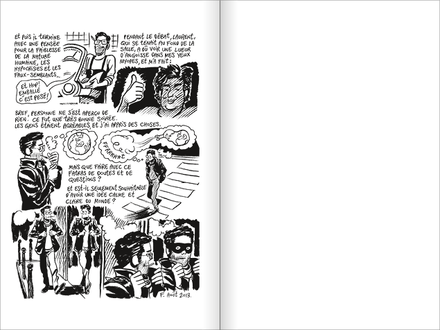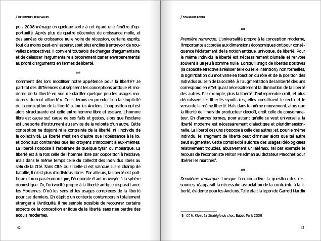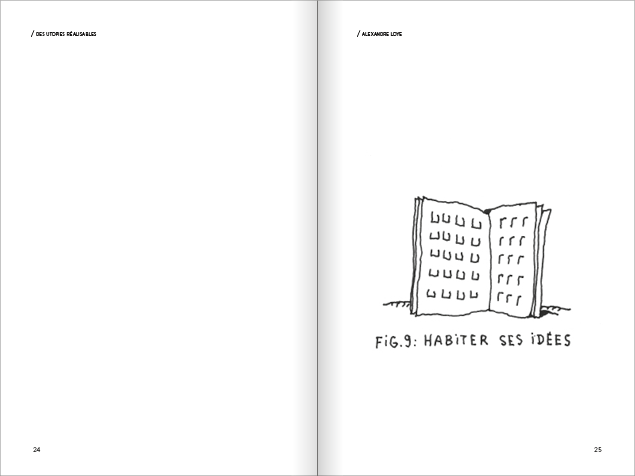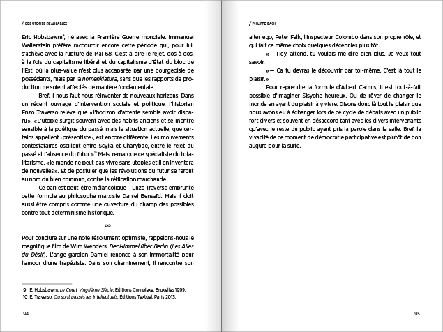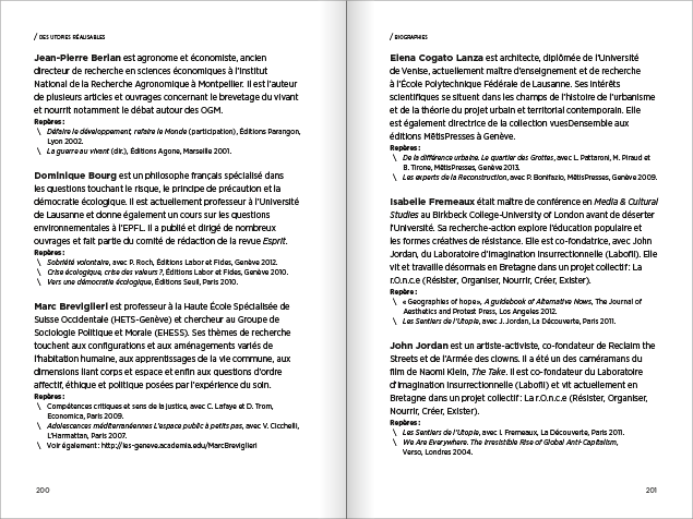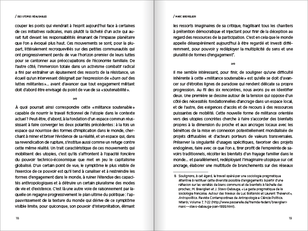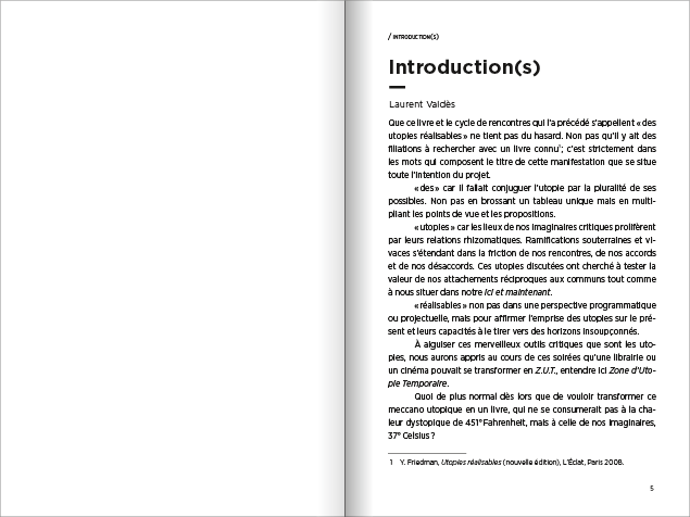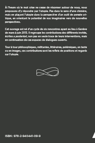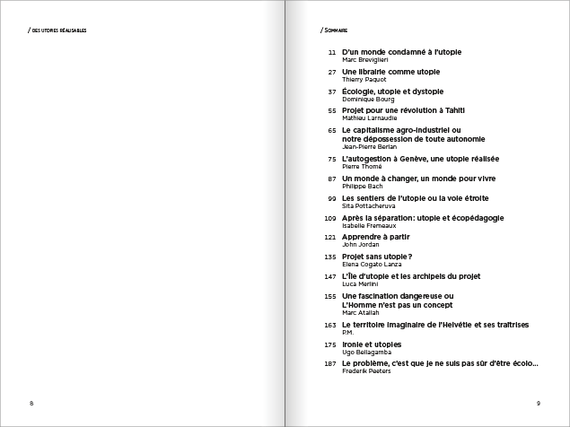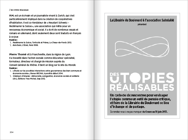 L’ouvrage des utopies réalisables a vu le jour sur une proposition de l’association Salmiakki à a•type éditions. Recueil de textes rédigés à l’issue d’un cycle de six rencontres organisées sur le thème de l’utopie comme outil de pensée critique, cette publication tient lieu à la fois de mémoire et de prolongement de ces rencontres puisque les récits qu’il rassemble ont déjà eu l’occasion d’être confrontés les uns aux autres lors des rencontres. Elle offre donc un espace d’expression supplémentaire sous la forme d’une rencontre d’un différent type où les savoirs et réflexions s’expriment après avoir été en contact, augmentée d’interventions extérieures. Le graphisme de cette publication a été réalisé par matière grise dans un petit livre où les textes se succèdent. matière grise a aussi réalisé la communication visuel de ce projet avec un flyer pour chacune des rencontres et le site internet.