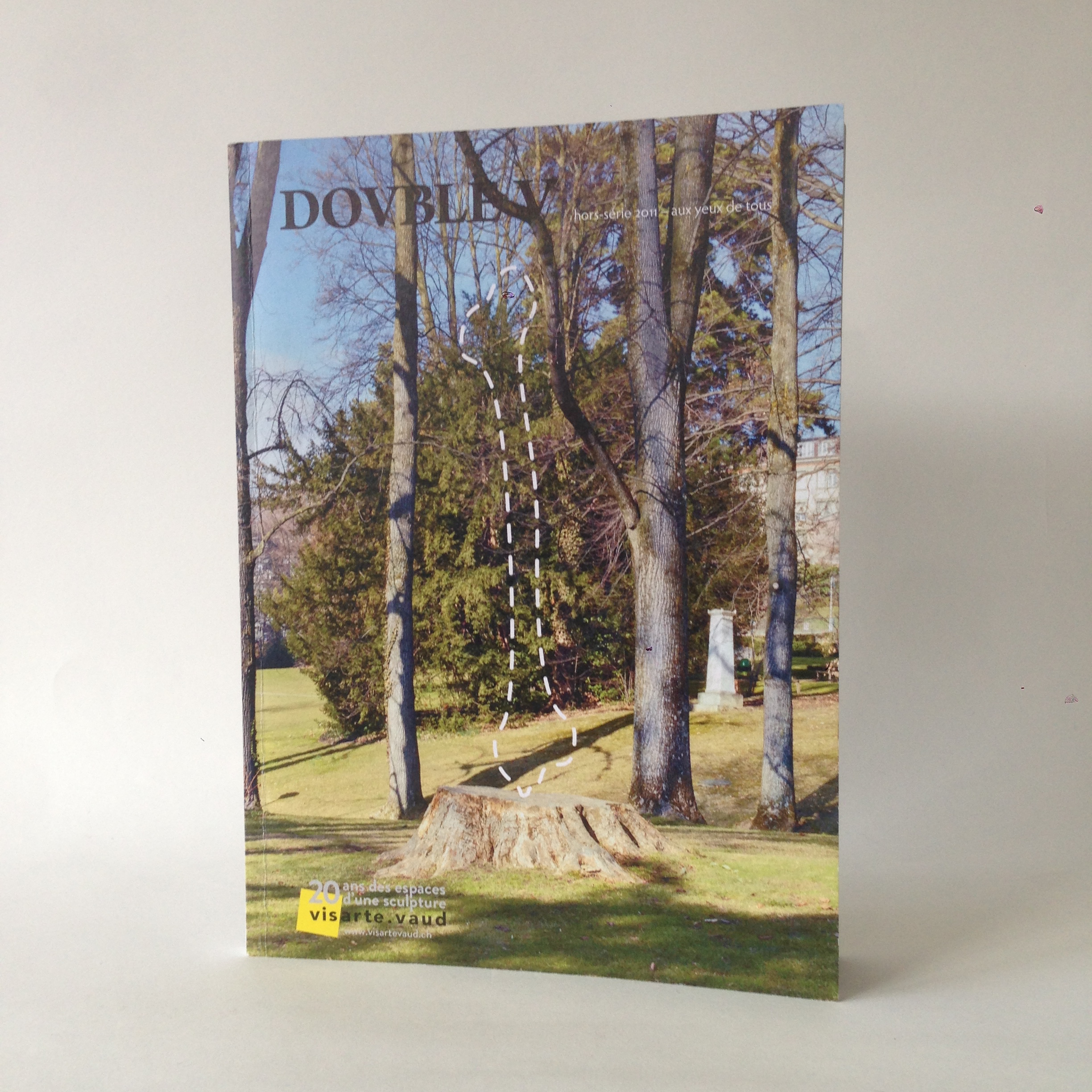En 2011, Visarte.Vaud, société des arts visuels, a proposé une exposition de sculptures en plein air afin de célébrer le 20e anniversaire des « Espaces de sculpture » organisés depuis le début des années 1990 par le comité SPAS vaudois (Société des peintres sculpteurs et architectes). Afin de rendre hommage à ces lieux temporaires d’exposition de sculptures mis à disposition par SPAS, Visarte.Vaud a donc proposé de nouvelles sculptures en plein air à l’emplacement de ces espaces historiques et en investissant aussi le parc Mon-Repos. Intitulée « aux yeux de tous », cette exposition a aussi donné lieu à un numéro hors série de la revue Dovble V qui présente l’exposition et les oeuvres. Dans cette publication, le travail du graphiste a une place particulière puisque, au lieu que la première partie du livre qui se présente comme une sorte de catalogue d’illustration ne représente les oeuvres dans leur espace d’exposition comme on aurait pu s’y attendre, les photographies des différents espaces sont vides et les oeuvres signifiées par des traitillés blancs prenant vie par leur légende. L’exercice de ce signe a aussi été repris sur l’affiche de l’exposition, aussi réalisée par matière grise.