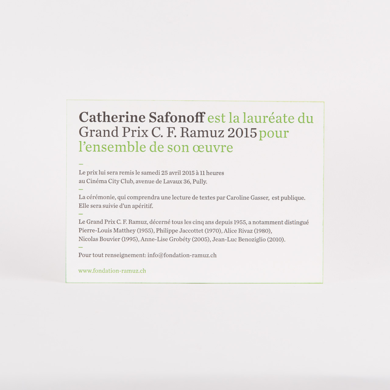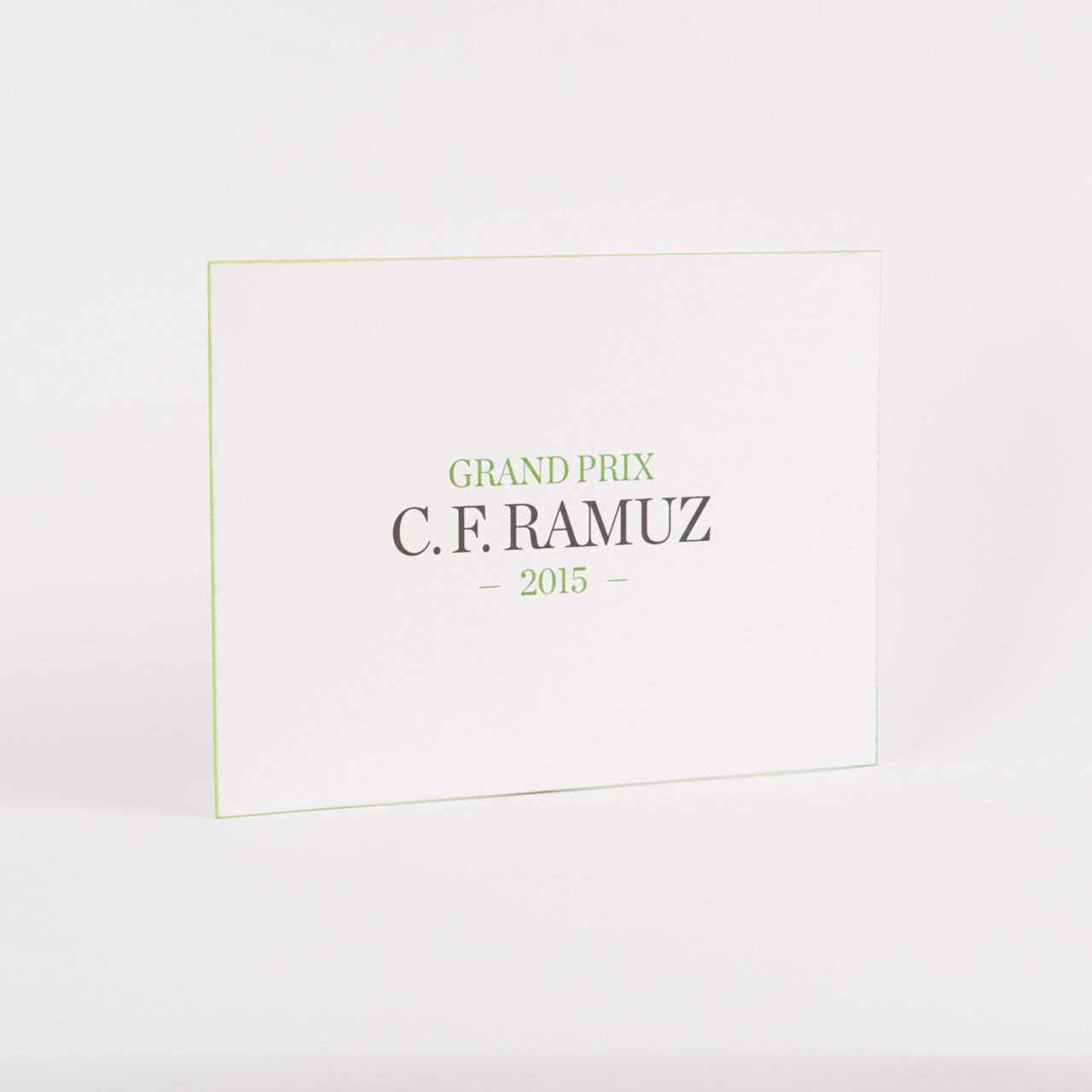 Fondation C. F. Ramuz | carton d'invitation à la remise de prix 2015 Carton A6 Impression typo 2 couleurs Carton Daunendruck white, 580g/m2 Tranche de couleur Projet parent Fondation C. F. Ramuz Clients Fondation C. F. Ramuz, Centre des littératures en Suisse romande (CLSR) Catégories invitation littérature Publié le 25 avril 2015 Images