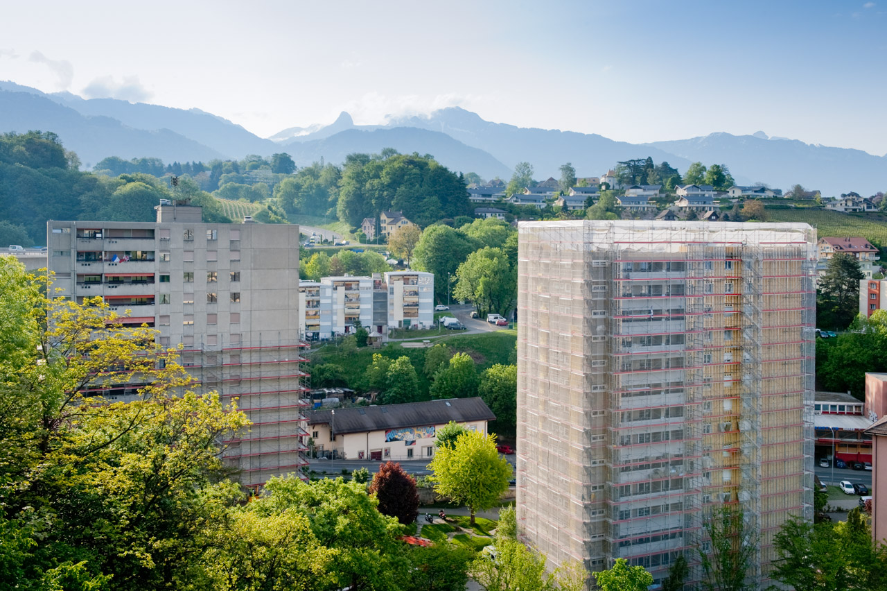 Isover a reçu le mandat de fourniture d’isolation dans le projet de rénovation des tours Gilamont à Vevey (qui recevront par la suite les fameuses fresque Charlie Chaplin).