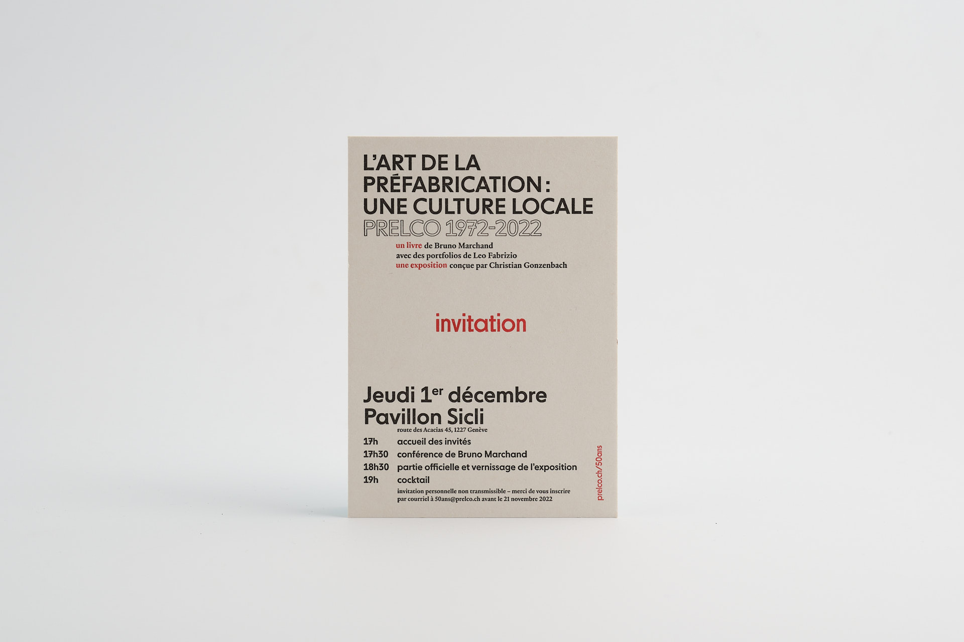 Ce carton A6 vertical convie les invités de Prelco au vernissage de la publication et de l’exposition éponyme, toutes deux réalisées pour les cinquante ans de l’entreprise de construction genevoise.