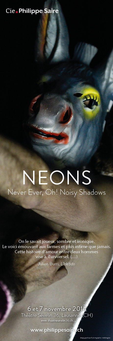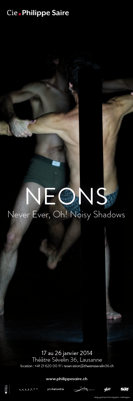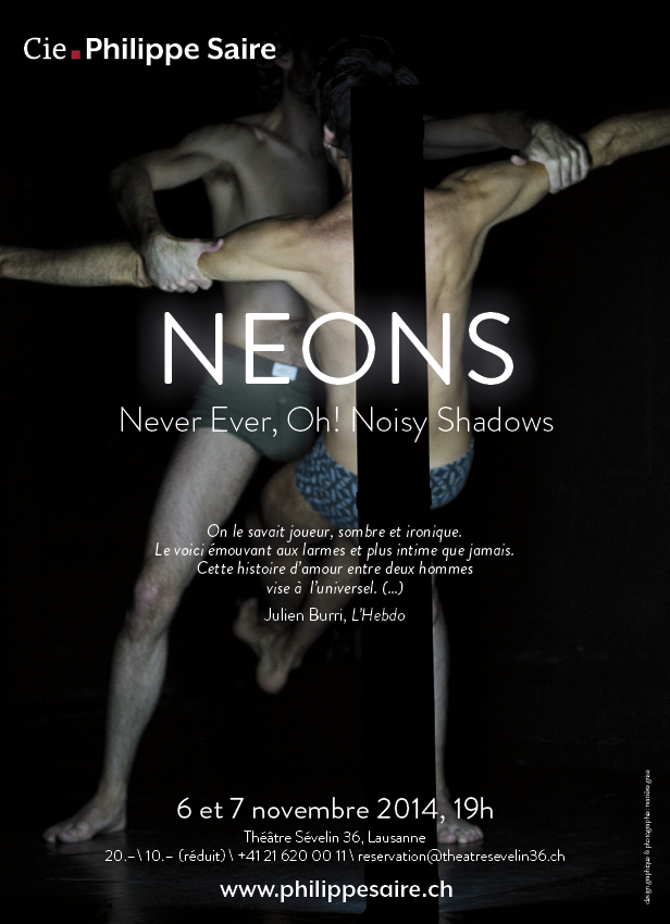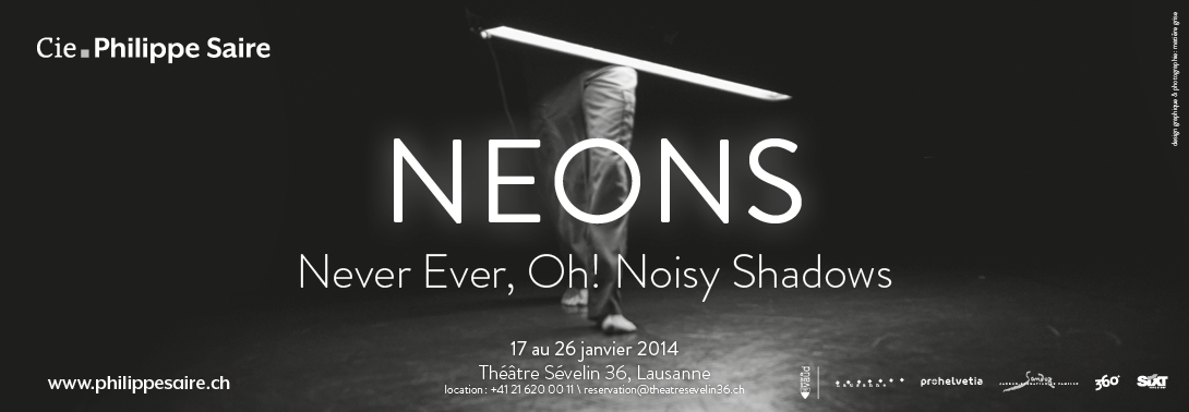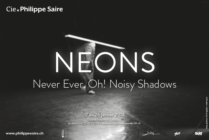 NEONS | annonces presse Annonces print ou web pour le spectacle NEONS, Compagnie Philippe Saire Projet parent NEONS Client Compagnie Philippe Saire Catégorie annonce Publié le 17 janvier 2014 Images