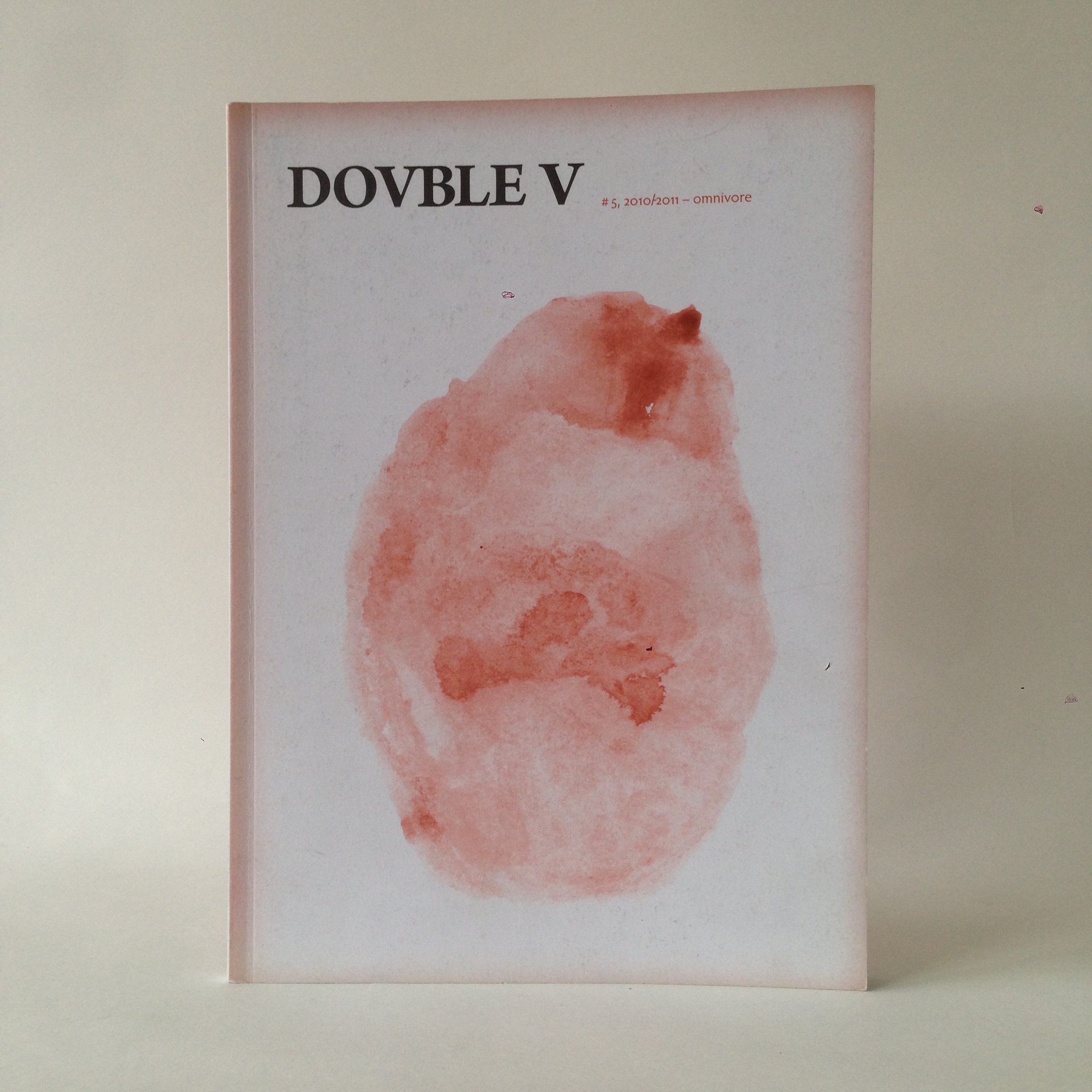 L’antenne vaudoise de la société des arts visuels Visarte a créé, en 2010, une nouvelle revue d’art: Dovble V. Tirant son nom des deux « v » de Visarte.Vaud et d’une intention de mettre des regards croisés en perspective, une double vue, cette revue succède aux quatre « publications annuelles » que Visarte.Vaud éditait depuis 2003 et est née avec le numéro 5. Cette première publication rassemble les travaux d’une quarantaine d’artistes et auteurs par le biais d’images et de textes créés autour du thème « Omnivore » qui titre cette revue, dans l’intention d’établir un lien entre la voracité du regard et l’insatiabilité de la faim. Pour créer ce nouvel objet, matière grise, qui a travaillé sur le graphisme et la mise en page de la publication, a repris le même format que celui des « publications » faisant écho à la continuité de sa numérotation. Le travail créatif de la couverture était spécifique dans ce projet qui réunit des contribution d’artistes au pluriel puisqu’il ne souhaitait pas reprendre le visuel de l’un d’entre eux au détriment des autres, et agissait aussi sous la contrainte de ne pas vouloir empiéter sur leur travail. C’est ainsi que le graphiste a créé « Jarret de veau », en estampillant le morceau de viande sur une feuille de papier, donnant par là-même son orientation chromatique à la publication dirigée par Stéphane Fretz, membre du comité Visarte.