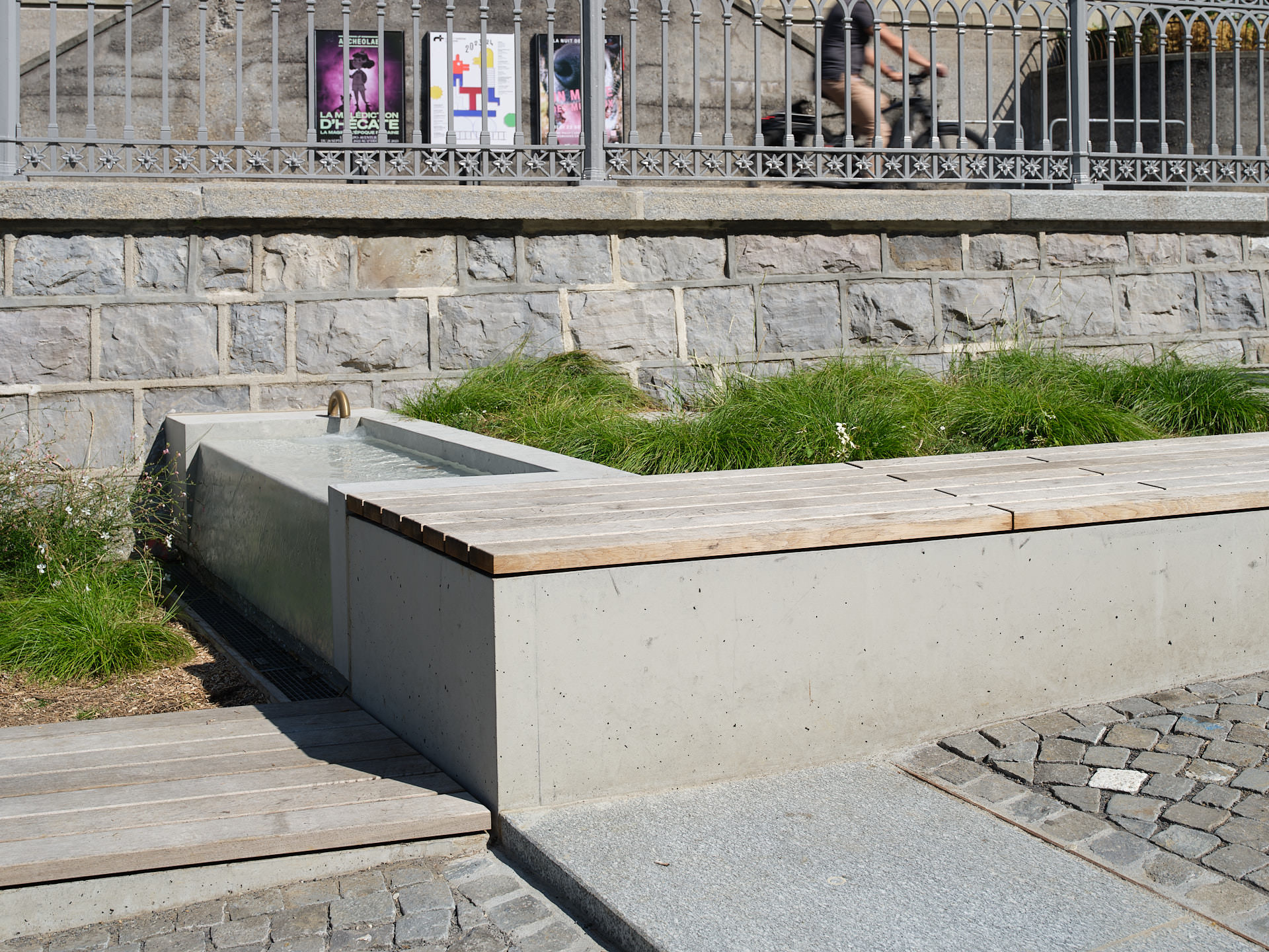 Ce premier mandat photographique du bureau msv (Manzoni Schmidig Vieuxloup) amène Philippe Weissbrodt à réaliser une série d’images sur un petit projet d’aménagement urbain. Un peu plus qu’une rue, pas vraiment une place, cet espace urbain à proximité directe d’un des bâtiments du Gymnase de la Cité est revalorisé avec finesse et intelligence par le bureau msv, créant une placette avec point d’eau et ombrage aux portes du quartier de la Cité.