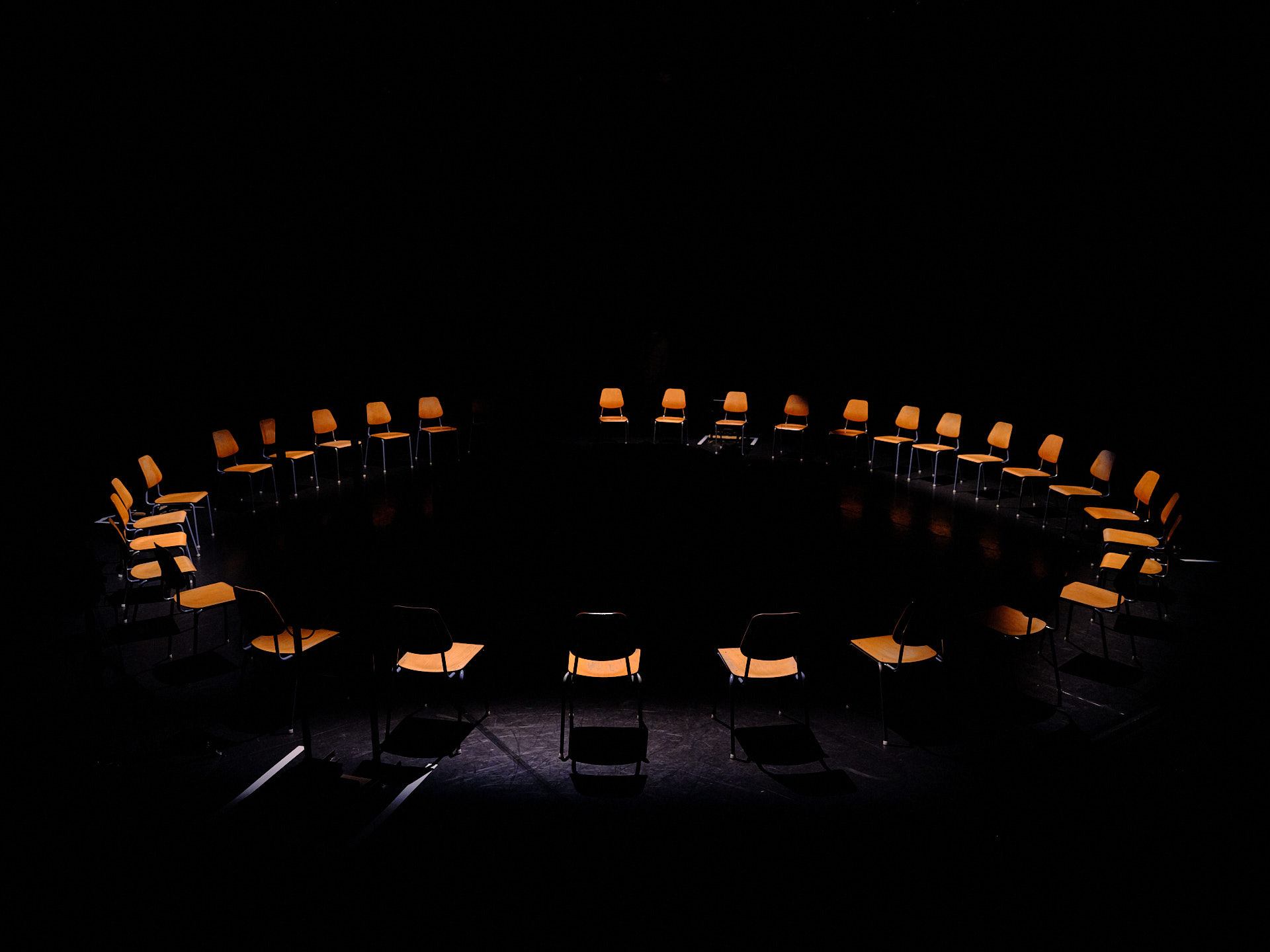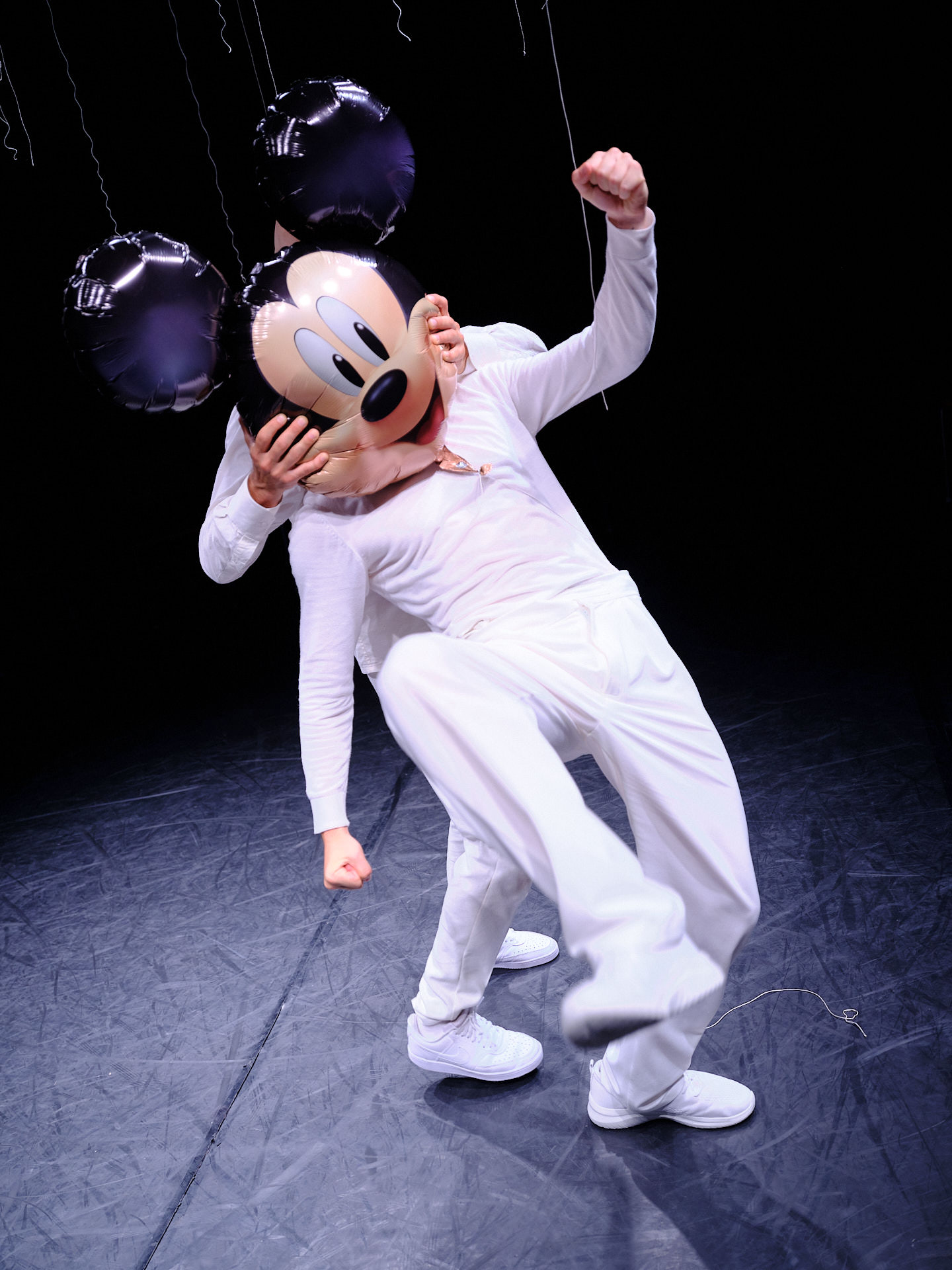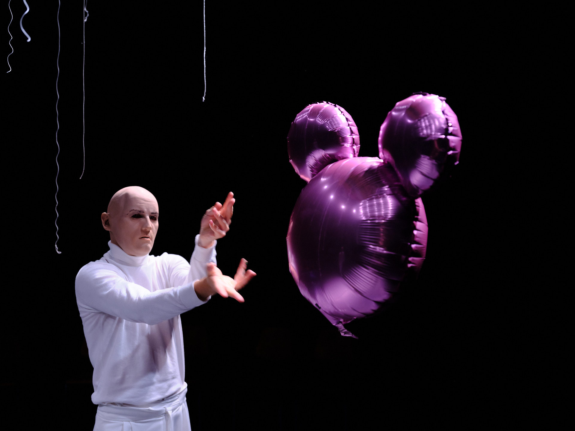 Dans un espace scénique circulaire, deux interprètes dansent avec des ballons. Masqués tels des braqueurs, leur présence tranche dans cet univers de divertissement populaire, et questionne la tension entre captif et captivé.