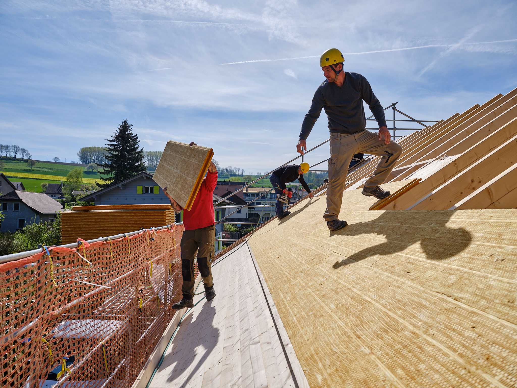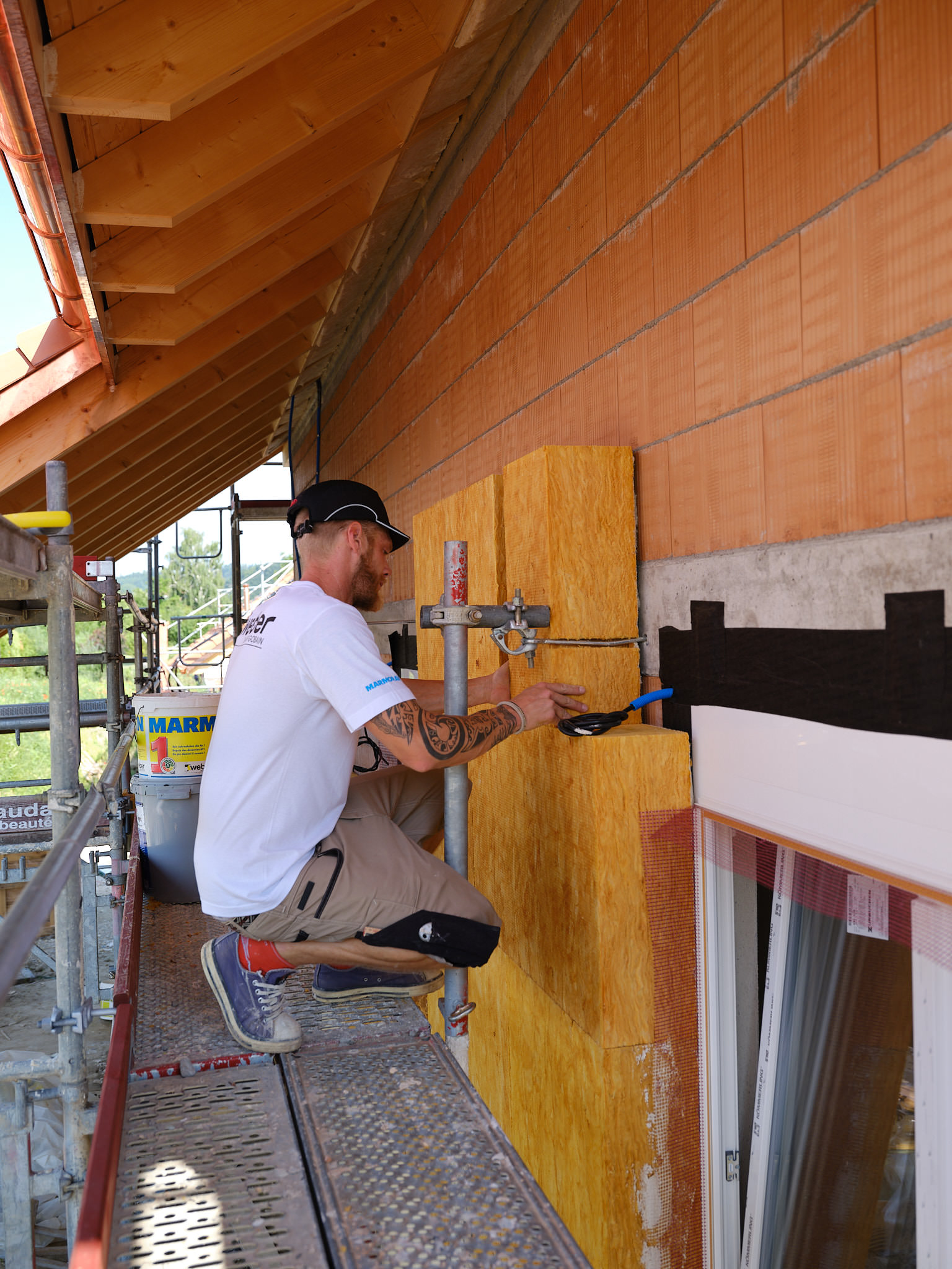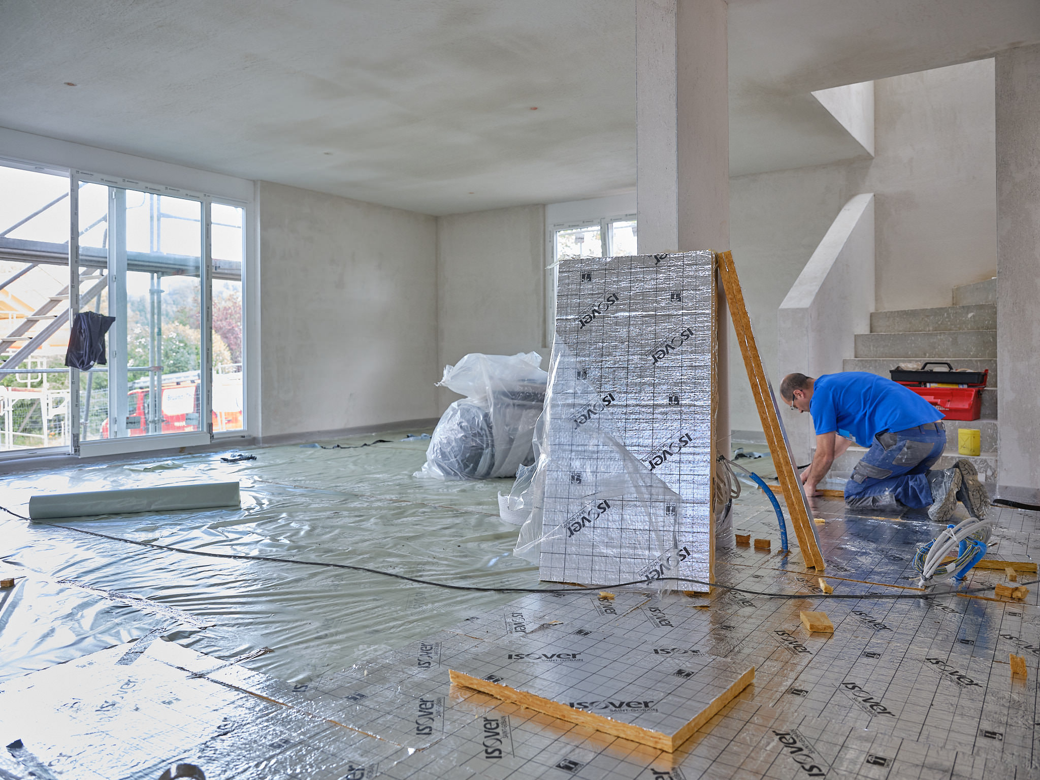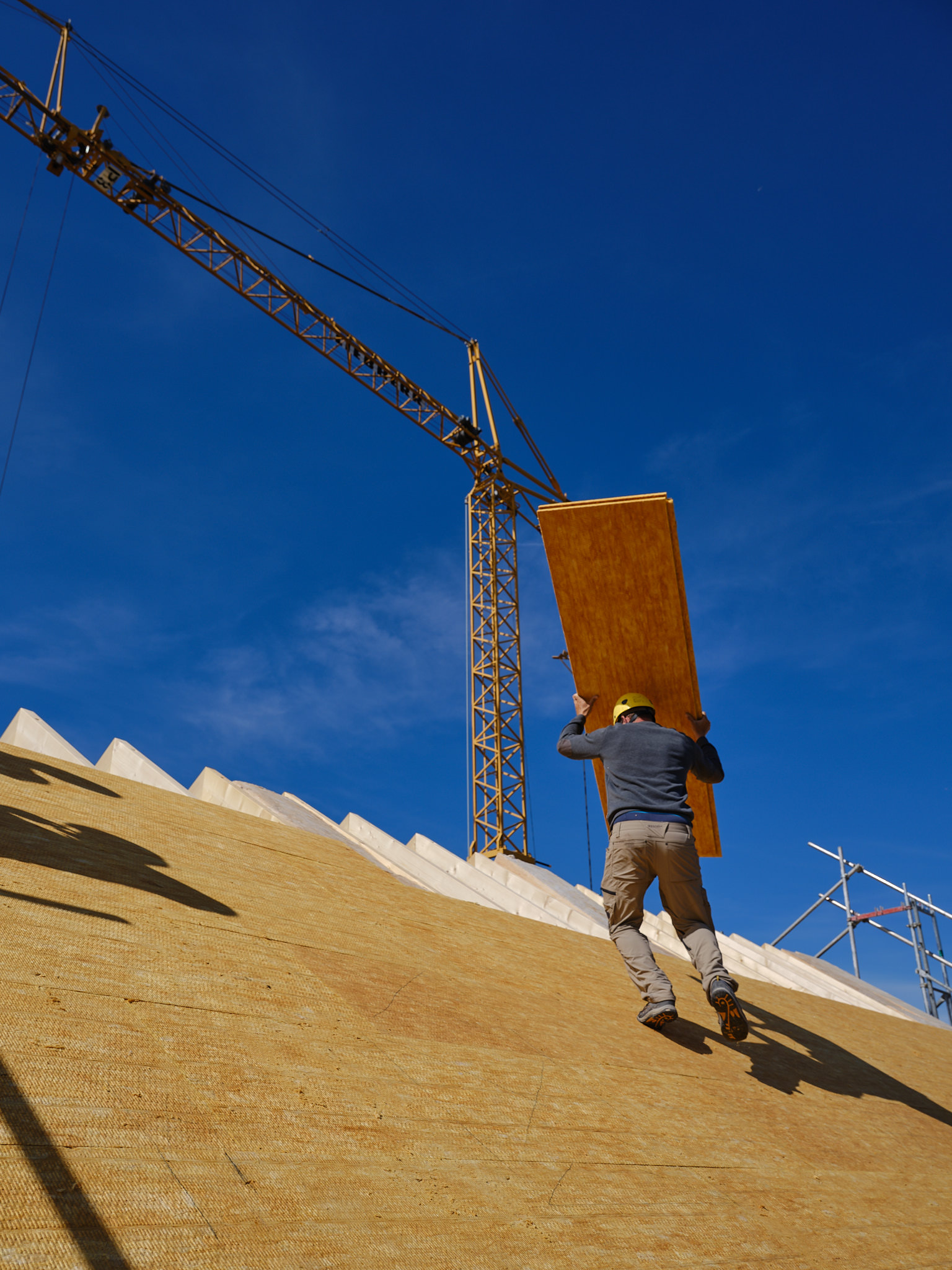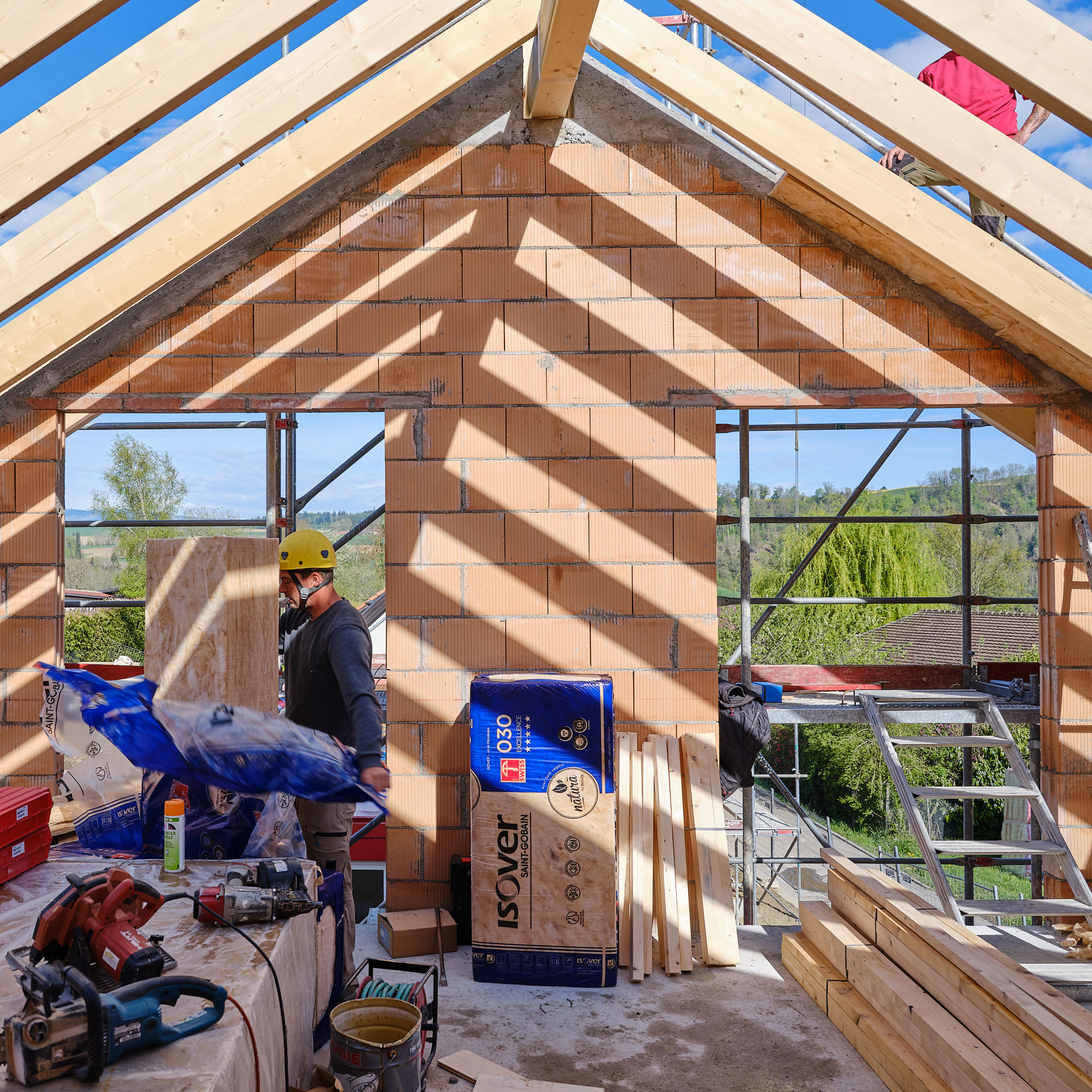 Isover a mandaté Philippe Weissbrodt pour réaliser le suivi de chantier photographique et vidéo d’une villa individuelle intégrant plusieurs de ses produits, en particulier les premiers panneaux solides en fibre de verre Isorigid, directement sur les chevrons de toiture, ainsi que d’autre produits du groupe Saint-Gobain).