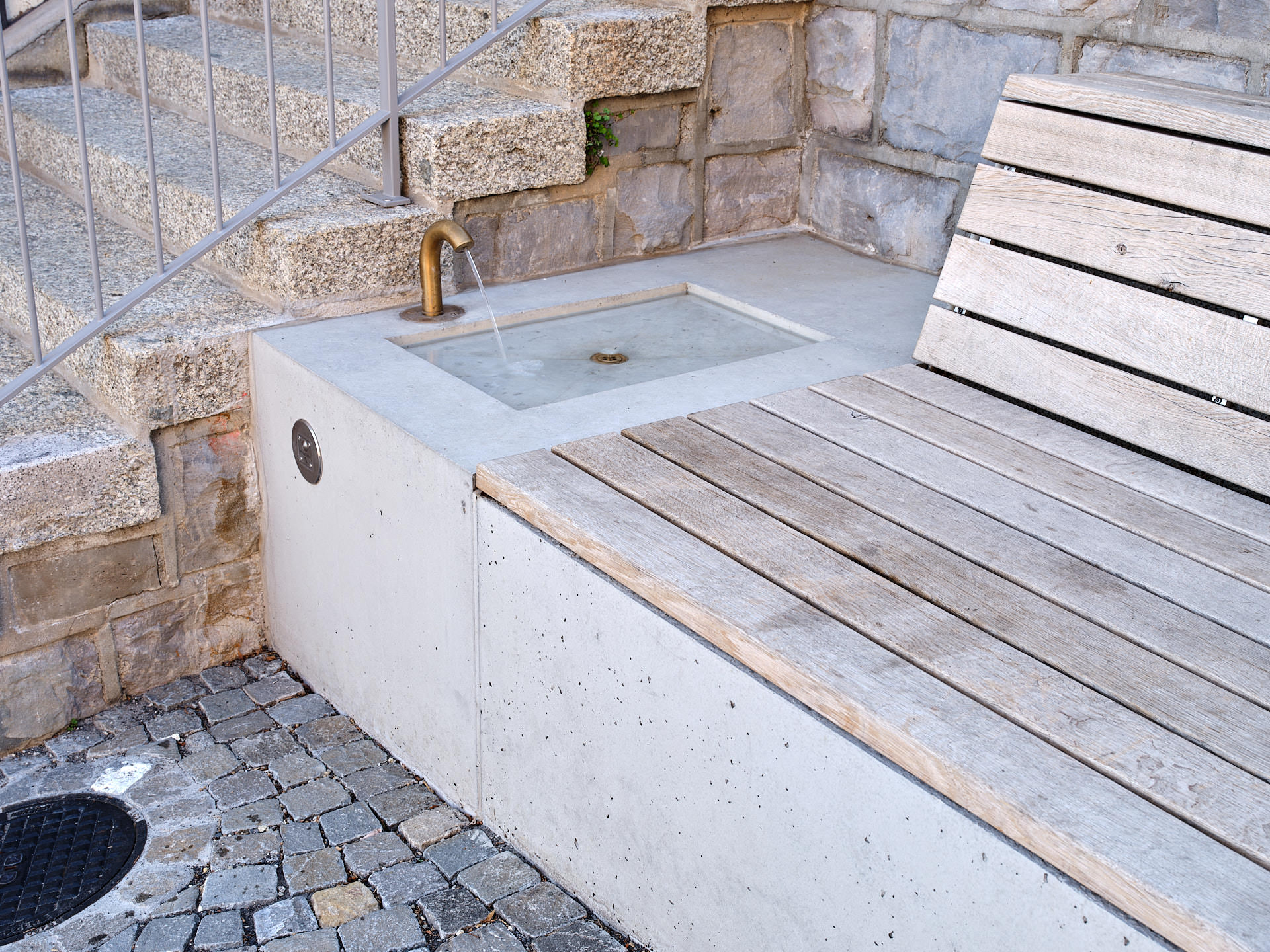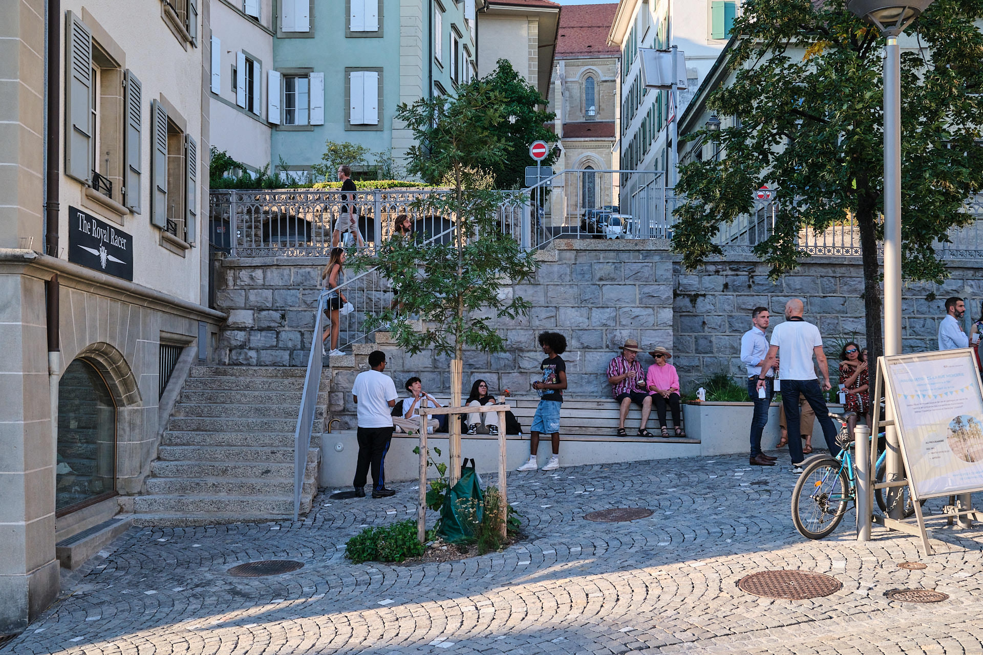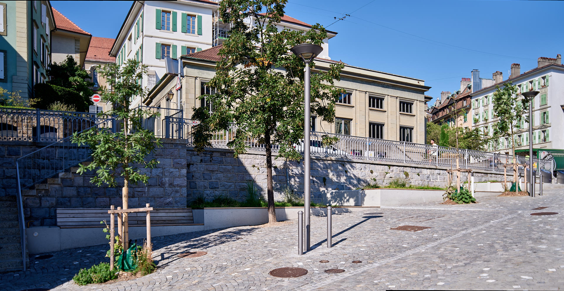 Ce premier mandat photographique du bureau msv (Manzoni Schmidig Vieuxloup) amène Philippe Weissbrodt à réaliser une série d’images sur un petit projet d’aménagement urbain. Un peu plus qu’une rue, pas vraiment une place, cet espace urbain à proximité directe d’un des bâtiments du Gymnase de la Cité est revalorisé avec finesse et intelligence par le bureau msv, créant une placette avec point d’eau et ombrage aux portes du quartier de la Cité.